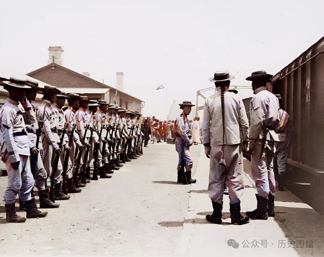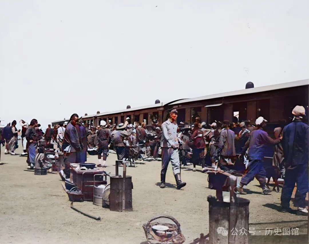 1909年,沈阳火车站上的景象。一列火车刚停靠在站台上,站台上挤满了人,都在等待上车。一名士兵从站台上走过,维护现场秩序。