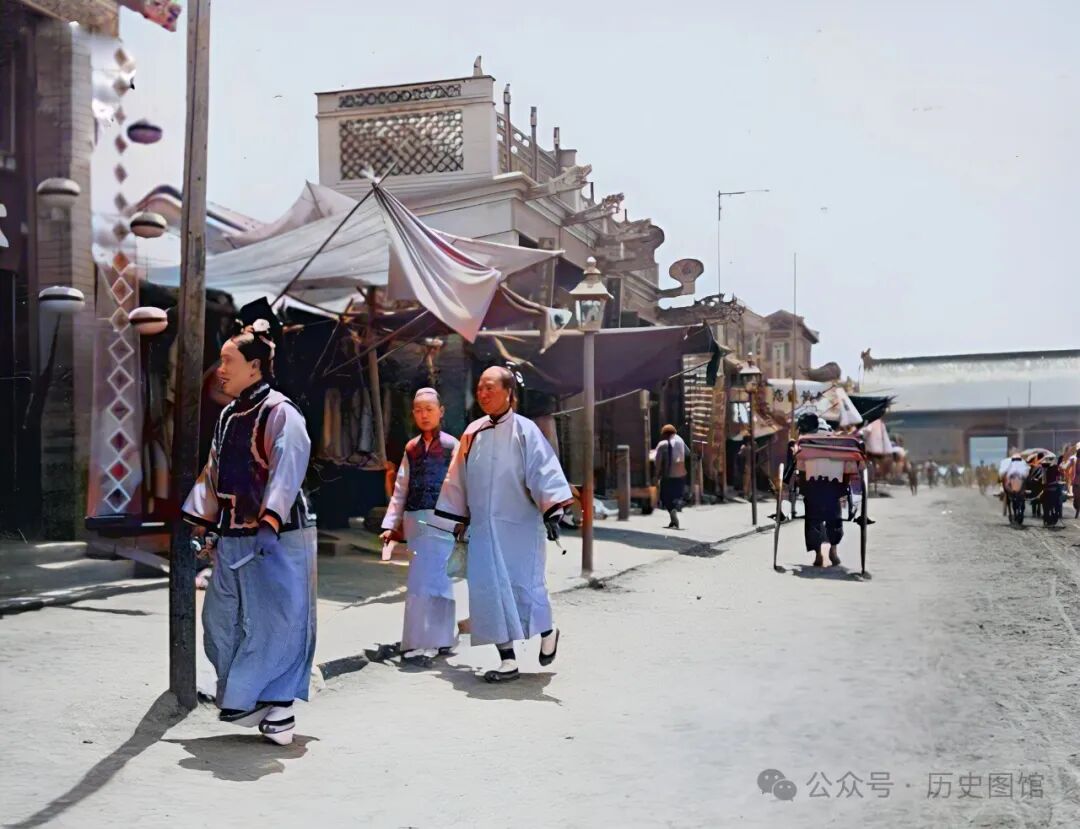 1909年,沈阳城内一条大街上的景象。街道宽阔,两边的商铺都在开门营业。几名身穿旗袍的满族妇女,正开心地逛街。街上还能看到有黄包车驶过。