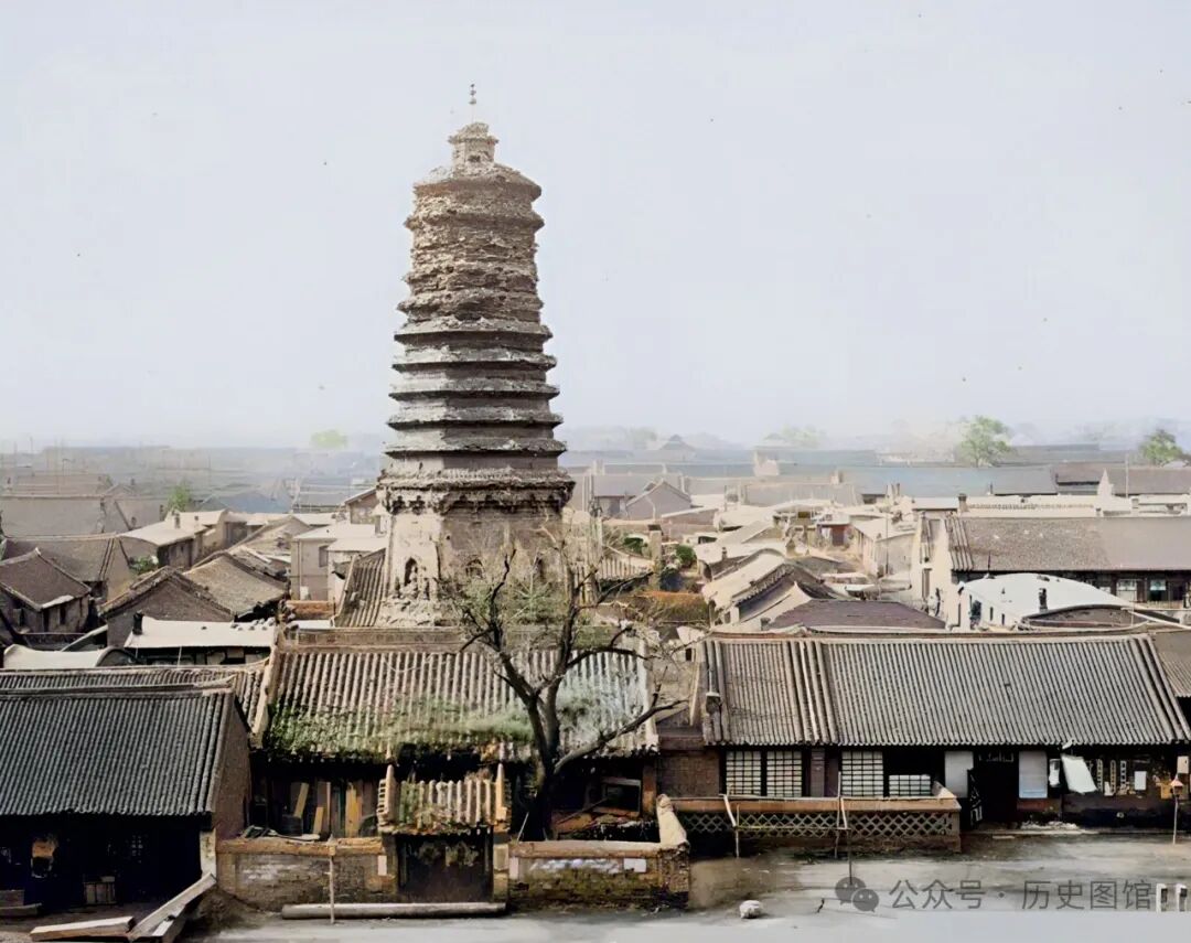 1909年,沈阳城北关外大北关崇寿寺古塔面貌。白塔始建于辽乾统七年(1107年),该塔全名为“释迦佛天生舍利塔”。塔身等边八角形,密檐11层,全为青砖筑。