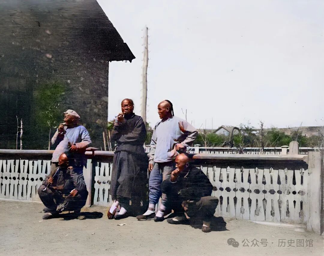 1909年,沈阳火车站边上,几名车夫正靠在围栏上吸烟。此时车站时人很少,他们站在路边闲聊,等待载客。