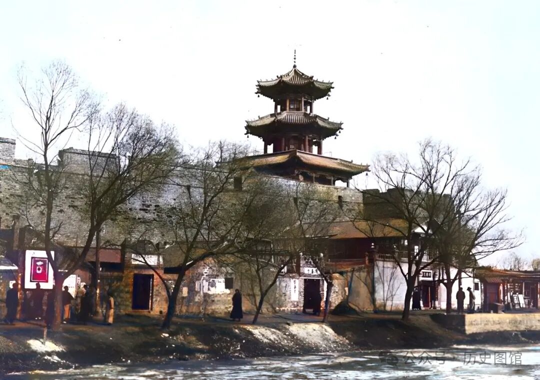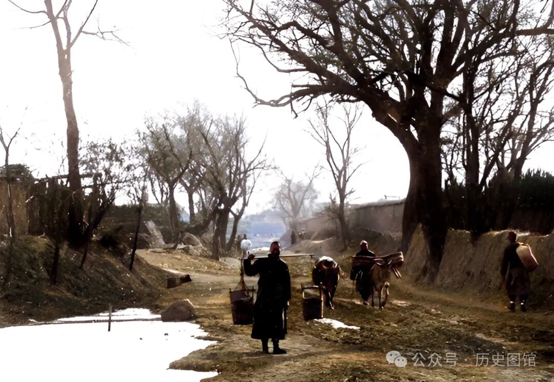 这张照片,拍摄于海城城外。高大的城墙,非常壮观,远处的城楼清晰可见。城墙下面是宽阔的护城河——沙河。一辆马车停在河边,车夫让马匹在河里饮水。不得不说,这画面太有年代感了。