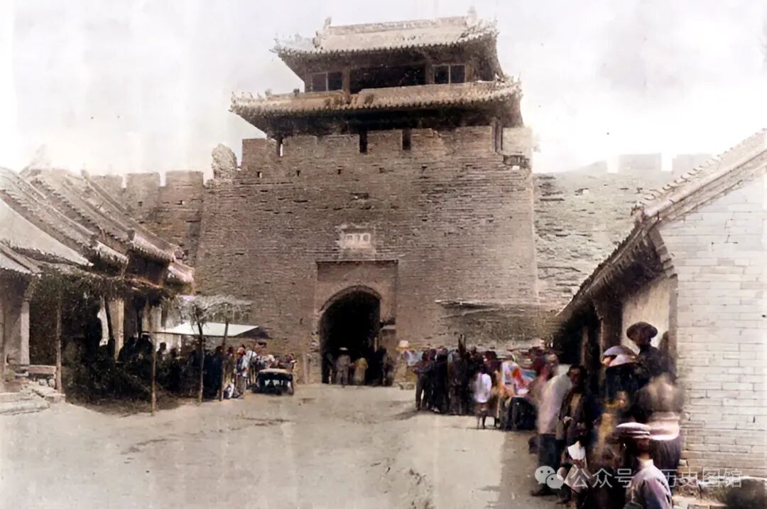 这是海城的东门——镇武门。在这座城门上,修建有陈楼。城门口有士兵把守站岗。城门前街道两侧,是一些店铺,都在开门营业。史料记载,日军占领海城后,将四座城门上的青石题额作为战利品拆走,存放在东京博物馆。