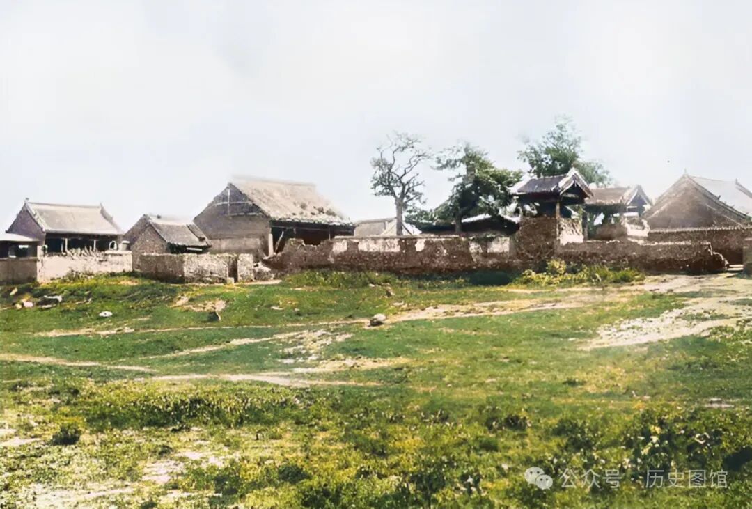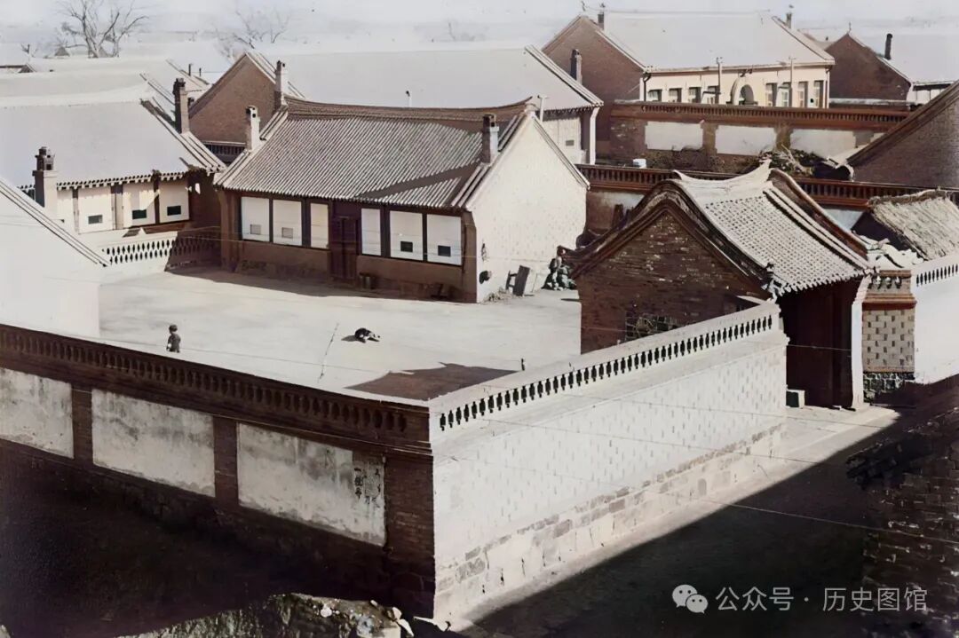 1941年,海城南门附近的民居院落。房屋为砖瓦结构,建筑样式为典型的北方四合院,院墙和门楼古色古香。主房和偏房的屋顶上,都能看到矗立着的烟囱。