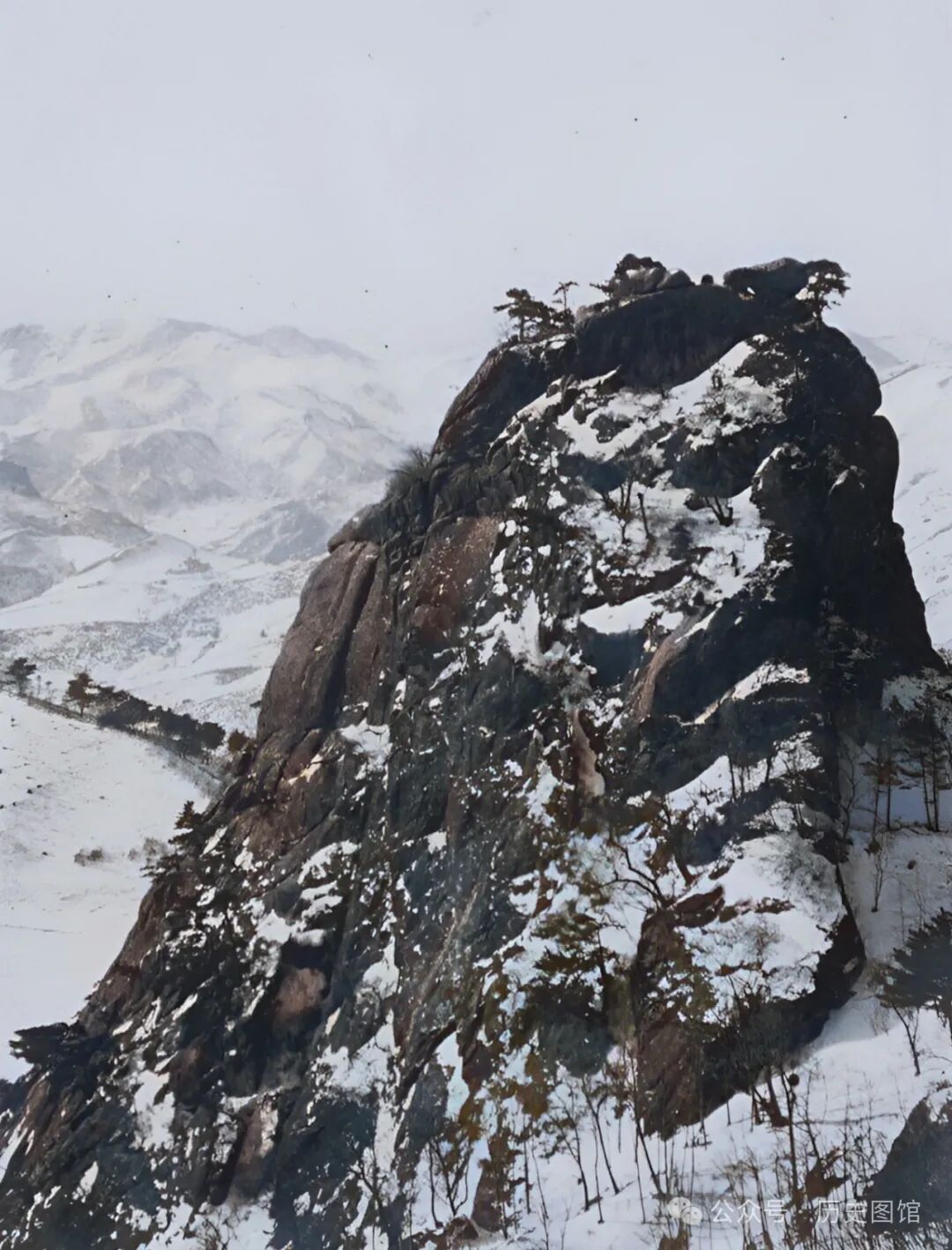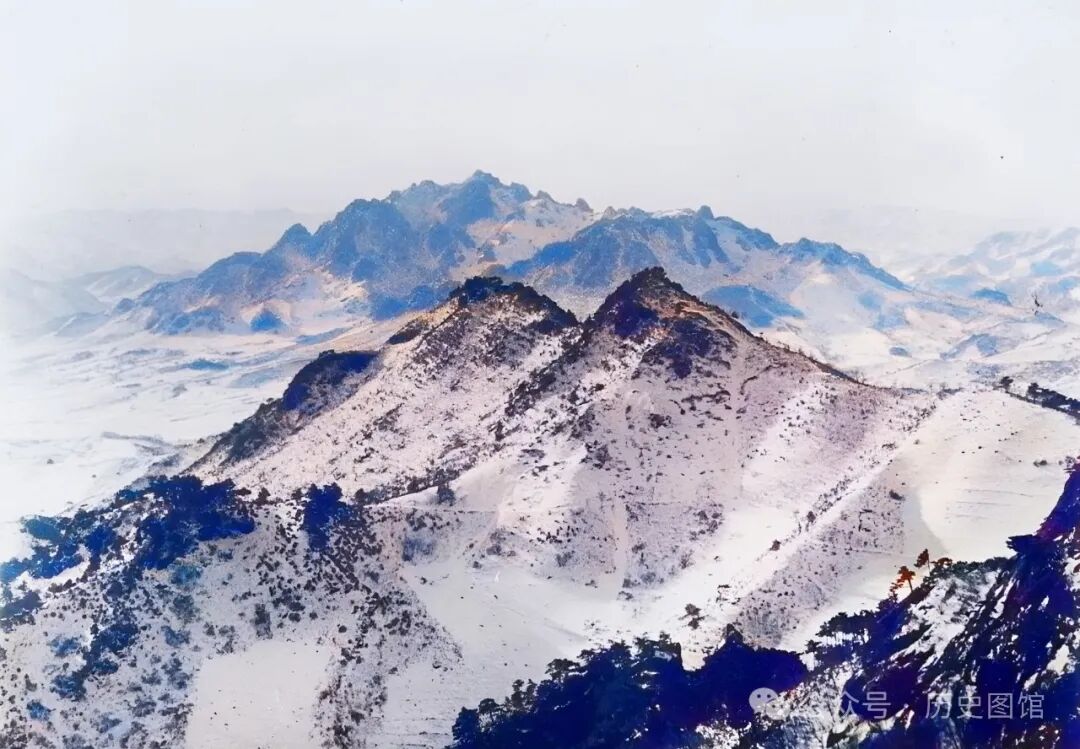 30年代,恢弘大气的千山雪景。站在山峰上远眺,山峦起伏。照片中两座山峰,看上去像是双翠峰,一片银装素裹的世界。薄雾里,山坡上松柏苍翠,山峰远虚近实,犹如一幅浓淡相宜的中国水墨画。