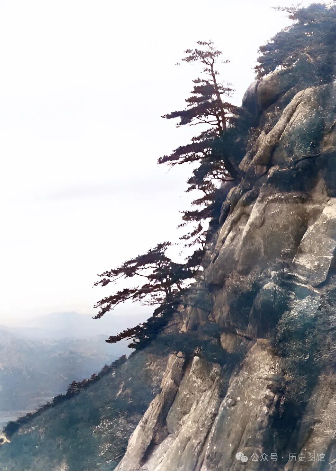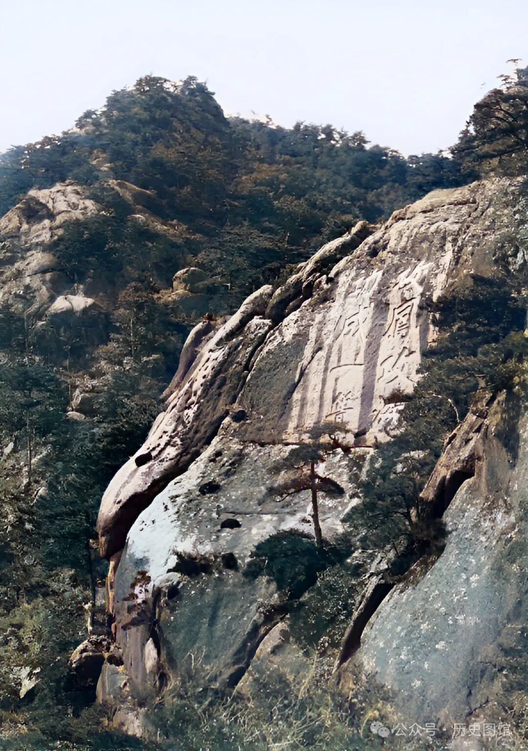 30年代,千山上的千佛崖景象。陡峭的岩石裸露在外面,壁立千仞。崖壁上生长着一些松树,看上去有种古朴苍凉之美。