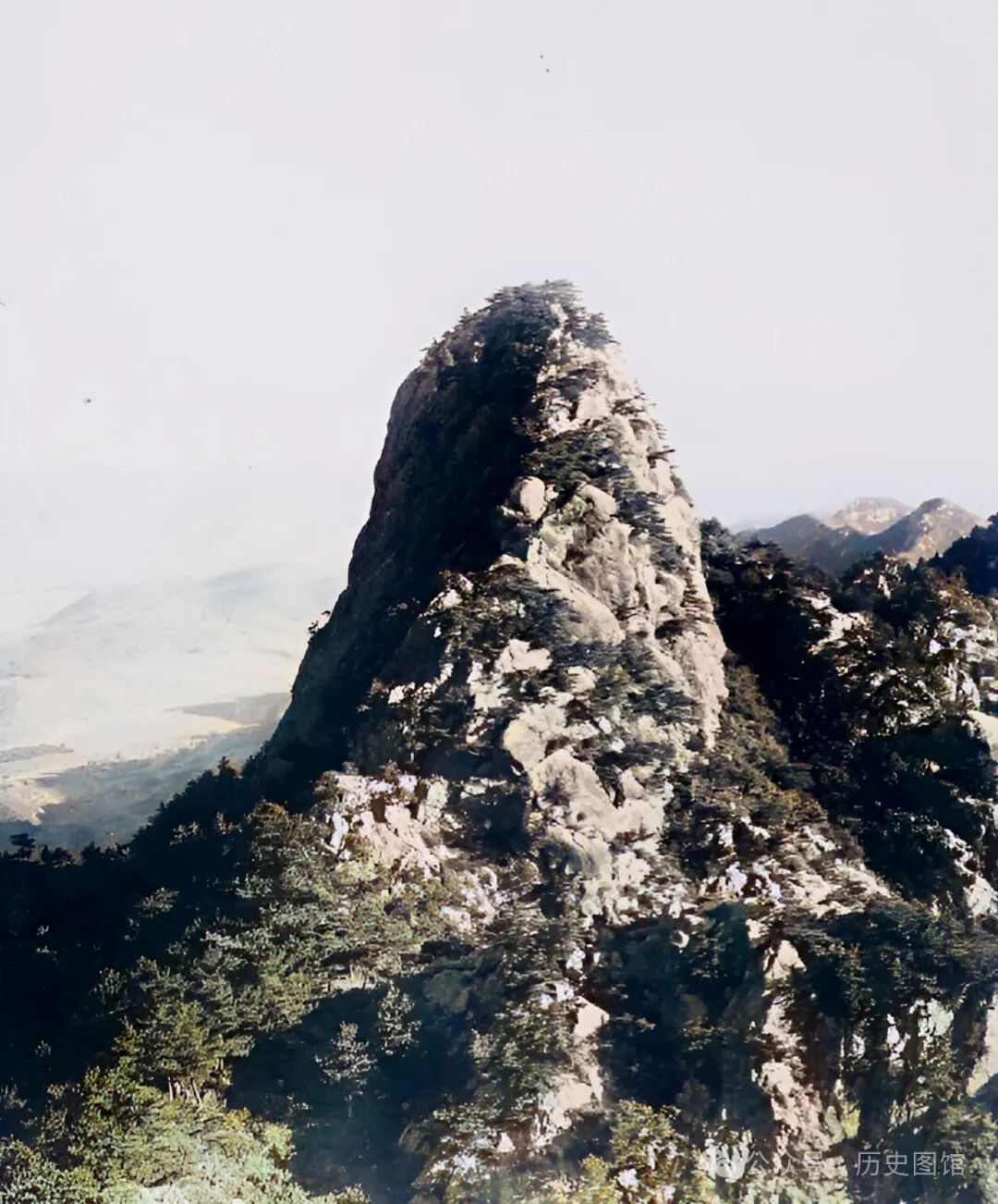 30年代,千山天柱峰景象。天柱峰位于东映峰北面、青云观东山主峰。海拔有500多米,山峰圆锥形,像一根柱子直插云霄。四周全是陡峭的山崖,很难攀登。在岩石缝隙中,生长着茂盛的松林,给山峰染上了一抹绿色。