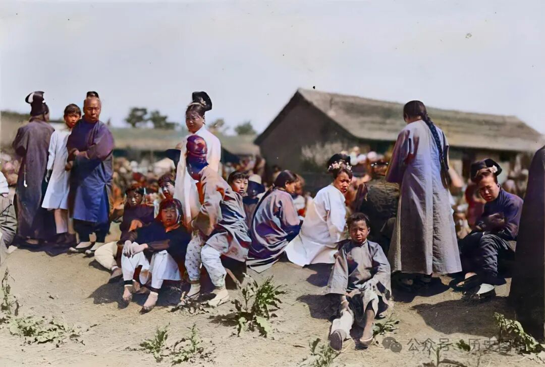 这张照片,拍摄于鞍山汤岗子附近。当时正在举行庙会,一群旗人妇女坐在土坡上休息。看到有人拍照,人们脸上露出了好奇的表情。