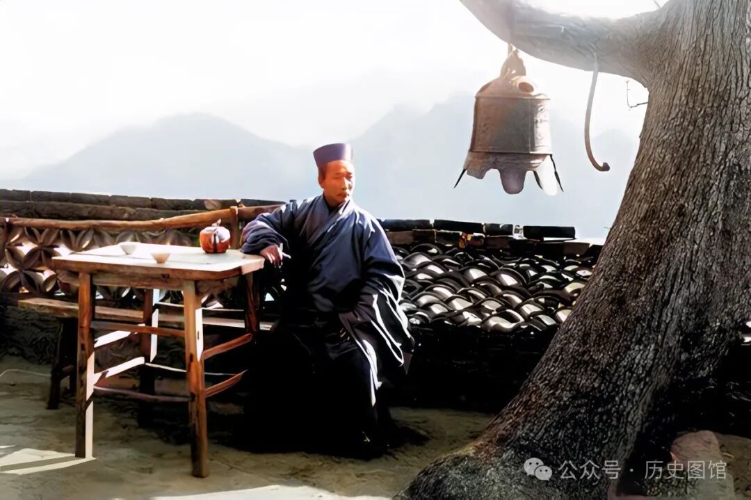 1930年,普安观前,一名道士身穿道袍,正坐在桌边,桌上摆放着茶盏。举手投足间,透露着仙风道骨。远处,薄雾里的山峦连绵起伏,犹如仙境。