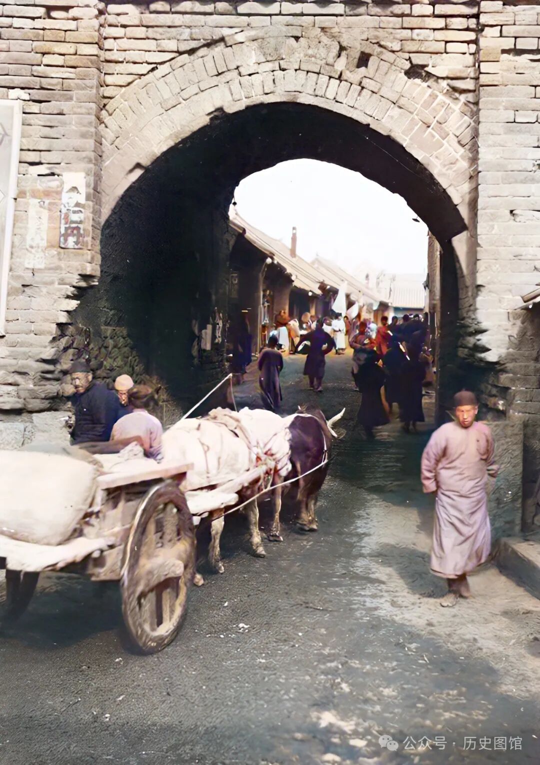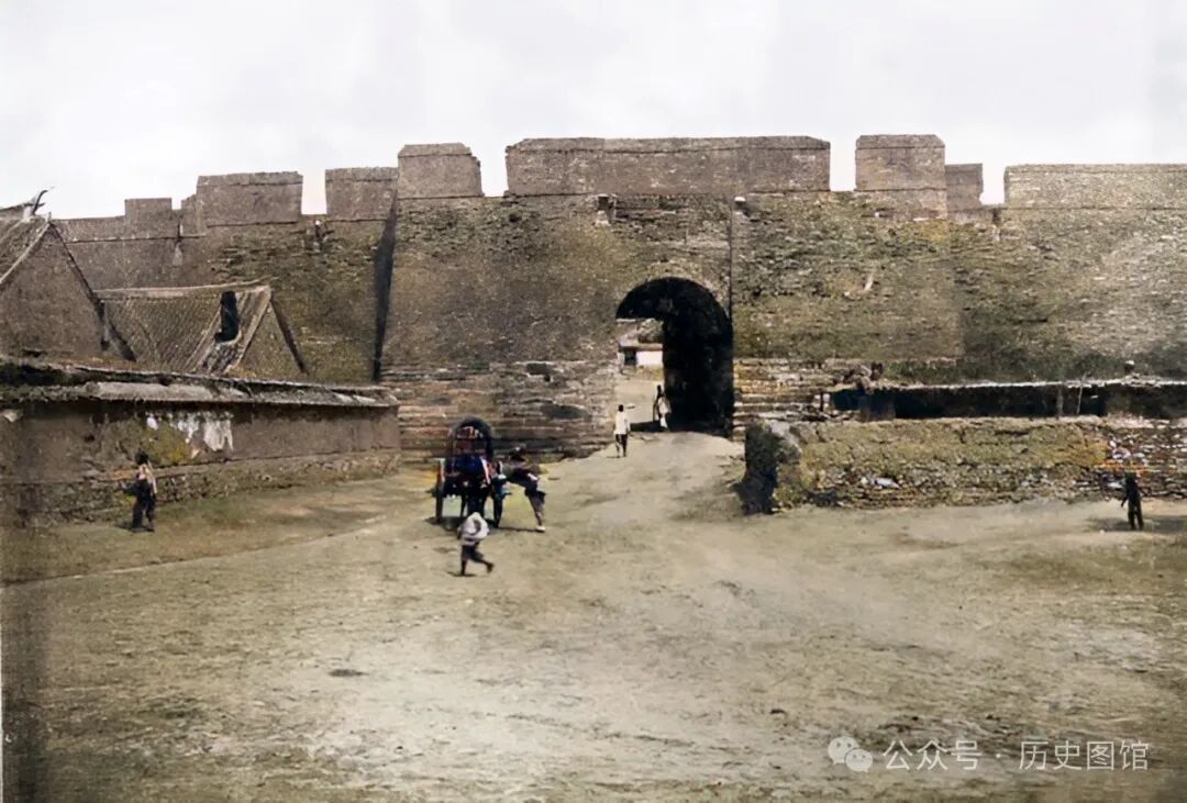 这是海城西城门——临清门前的景象。在五个城门中,北、西、南三座城门上没有城楼,城墙上的垛口很壮观。一名男子赶着马车从城里走出来。海城,还是张作霖发迹的地方。