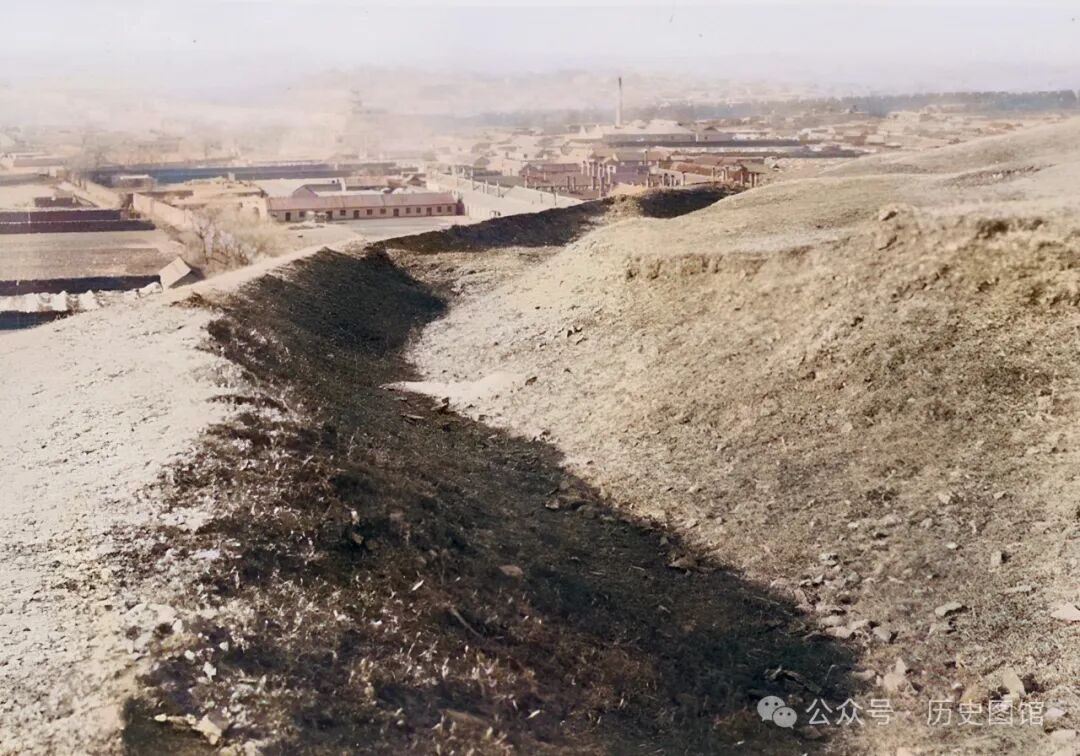 1941年,海城玉皇庙山附近景象。玉皇庙位于玉皇庙山南麓,始建于清朝初年。地上的壕沟,为当年日俄战争时留下的。玉皇庙历经数百年,香火鼎盛。上世纪60年代,玉皇庙被毁。2011年,复建一庙两阁:玉皇阁、城隍阁以及相关殿宇。