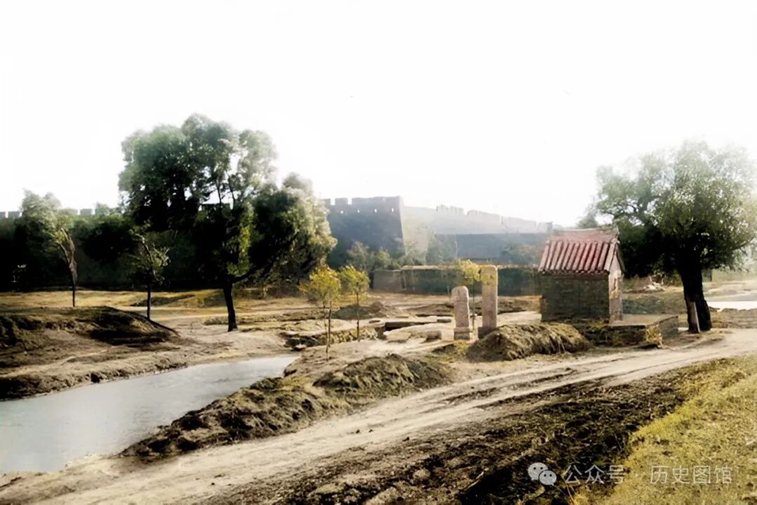 1930年,站在海城城外,这里能看到城墙的一角。城墙高大壮观,上面的垛口有几处缺失。护城河边的小路旁,矗立着一座小庙,应该是座土地庙。小庙的旁边,立着两通石碑。