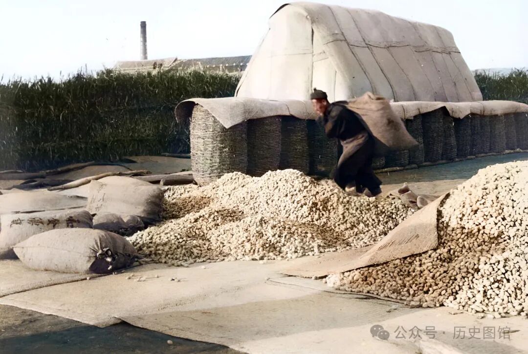 1941年,海城郊外一处收购蚕茧的站点。门前的空场上,堆满了蚕茧。一名蚕农正在整理蚕茧。旁边的一排竹篓里,盛放的也是上好的蚕茧。海城盛产柞蚕,柞蚕以柞树叶为食。