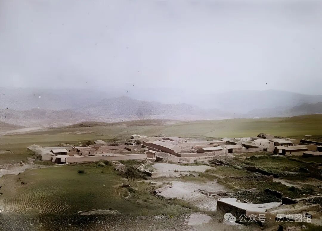 建筑群的前面,能看到种植有农作物的田地。四周是一片空旷、辽阔的草原。远处薄雾中的山峦时隐时现。