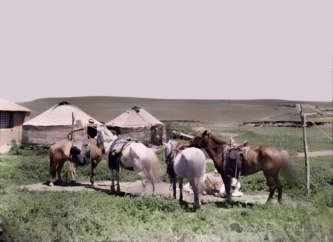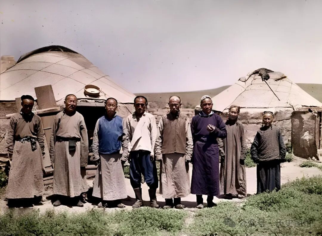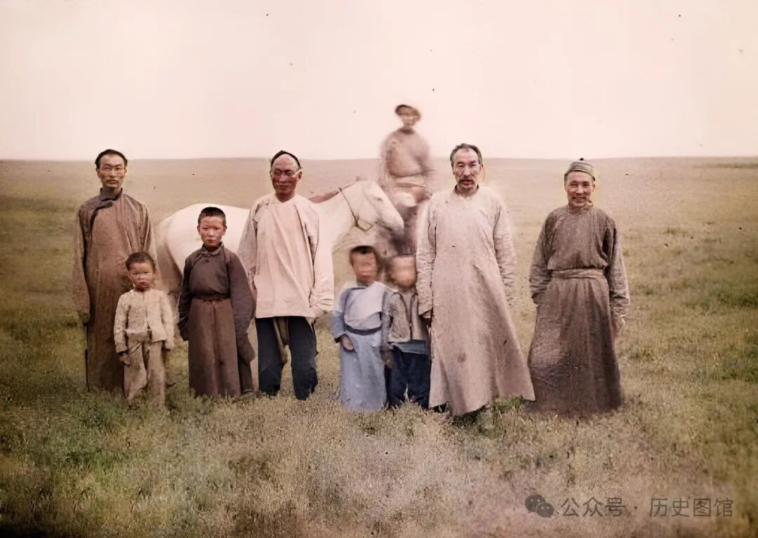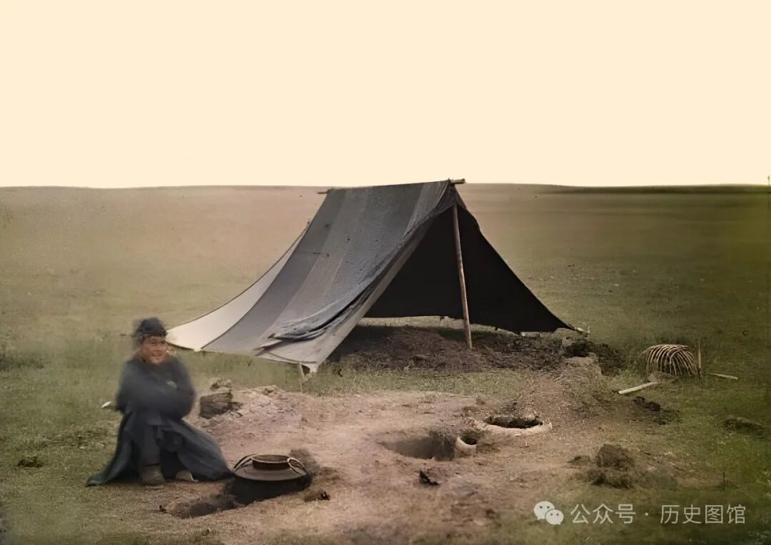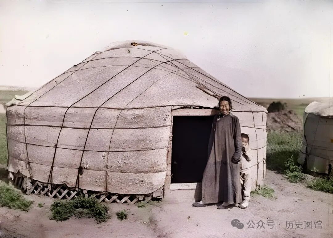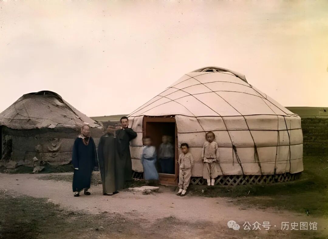 1912年,河北张家口一户人家的合影。几个大人站在自家的蒙古包前,四个孩子站在门口,显得有些拘谨。他们家这个蒙古包刚建成没多久,旁边那个蒙古包,看上去已经有些年头了。