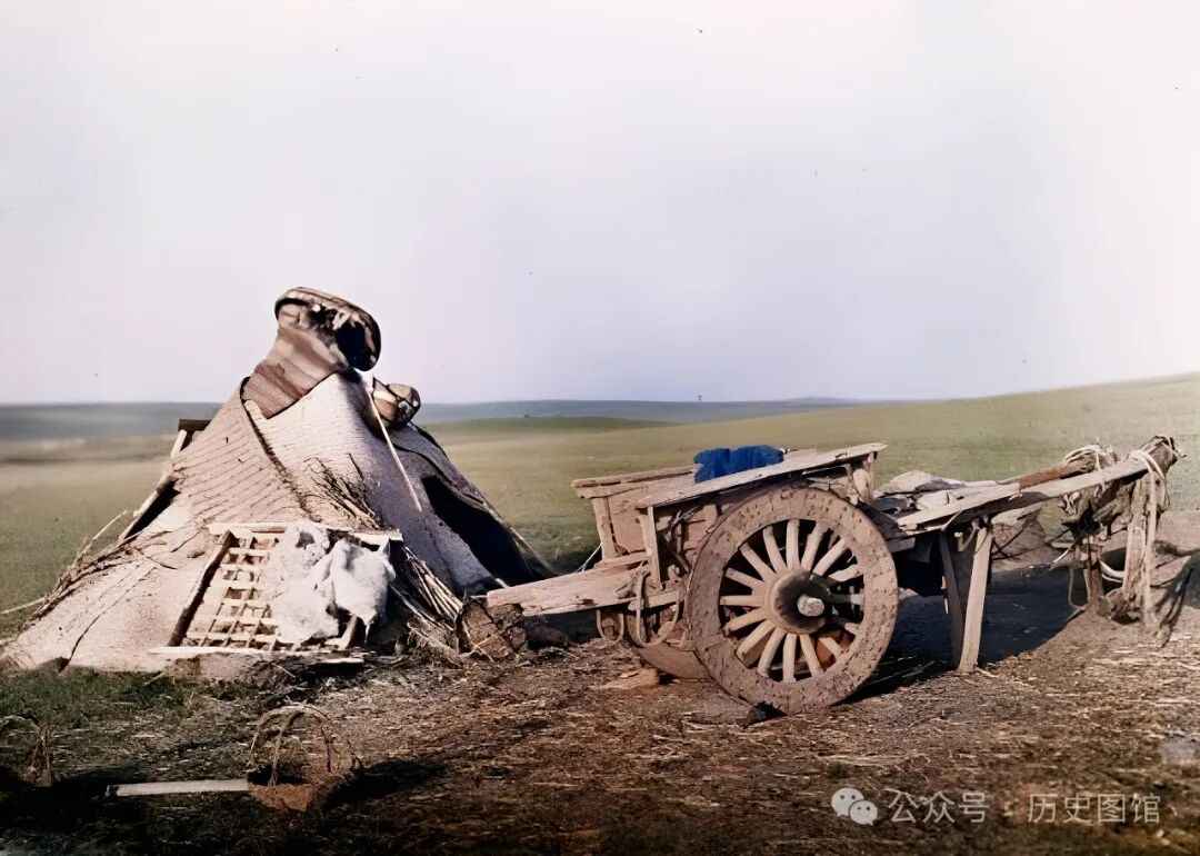 在一户人家的蒙古包前,停着一辆木轮马车,车轮上包有铁皮。这种马车载重量大、结实耐用,在草原上很常见。马车旁边还有一个圆锥形棚子,看上去很简陋,可能是主人建的一个杂物间或者是马棚。