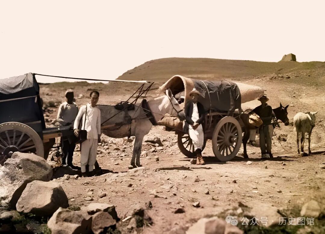 1912年,摄影师帕萨特一行人,行至张家口郊外,停下来休息。随行的两辆装载有设备和行李的马车,以及帕萨特在当地聘请的几名向导和助手。他为几名车夫拍下了这张照片。远处山坡上,一个烽火台清晰可见。