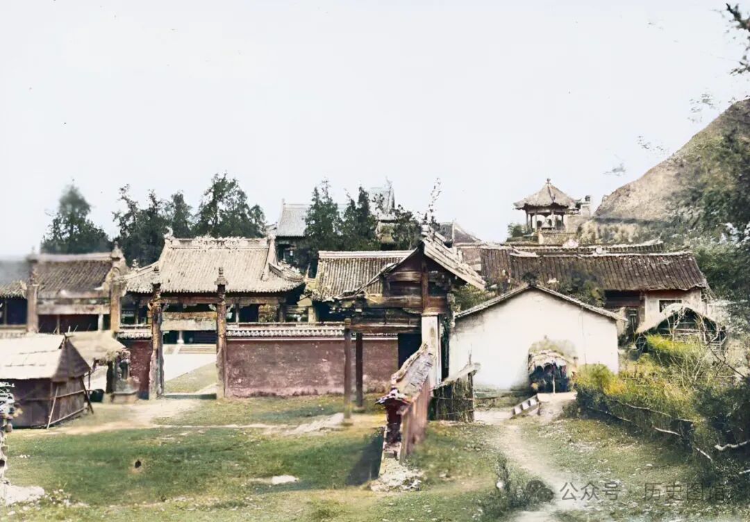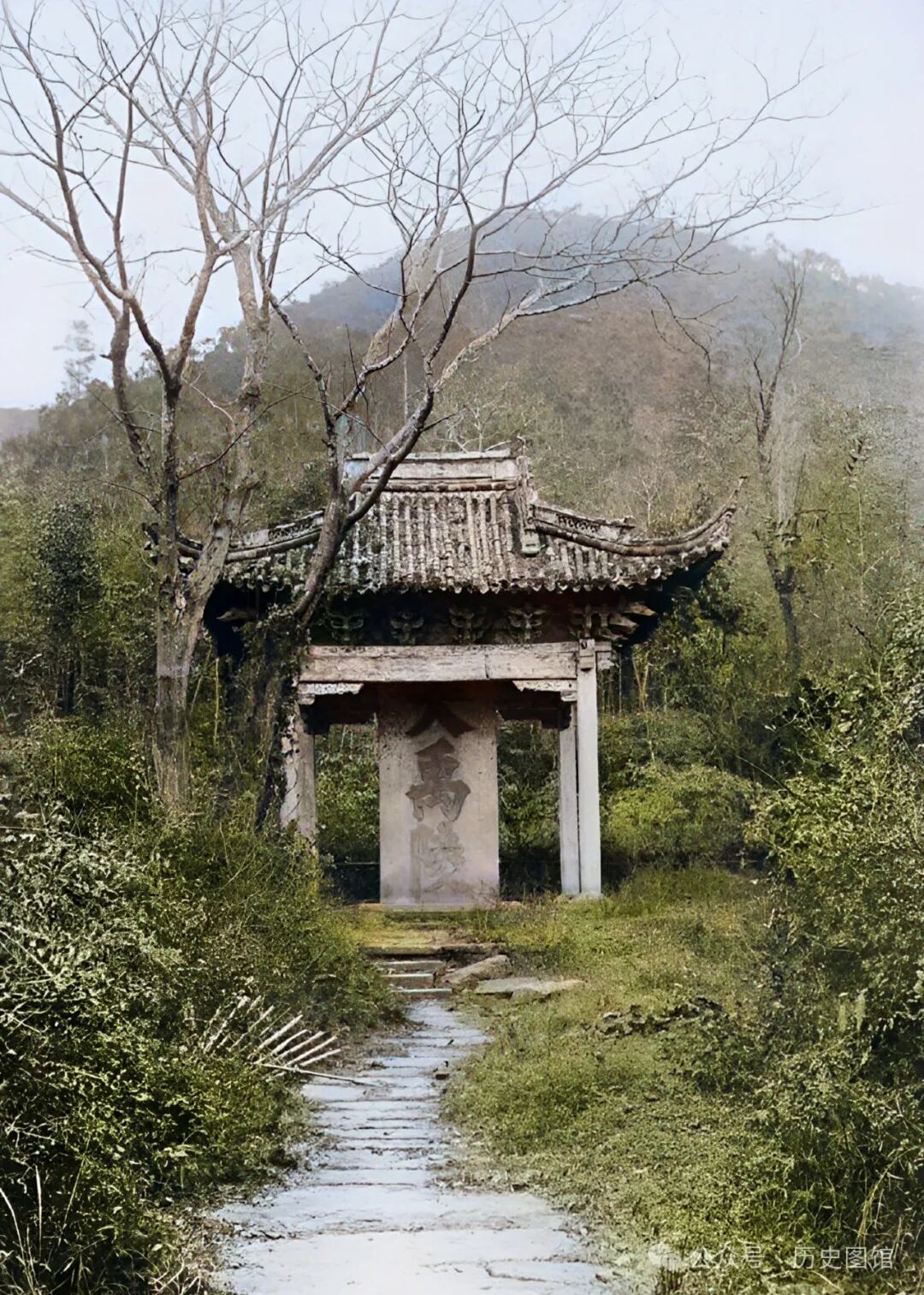 30年代,大禹庙景象。看上去有些破旧,一段围墙已经倒塌。高大的石牌坊和庙内的大殿,十分壮观。