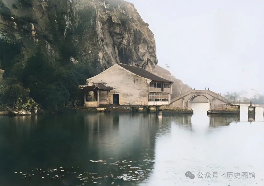 1930年,绍兴东湖秦桥附近景象。这座单孔石桥始建于清光绪年间(1875-1908)。小桥附近山清水秀,景色宜人。相传,当年秦始皇南巡时,曾在箬篑山下停车喂马而得名。