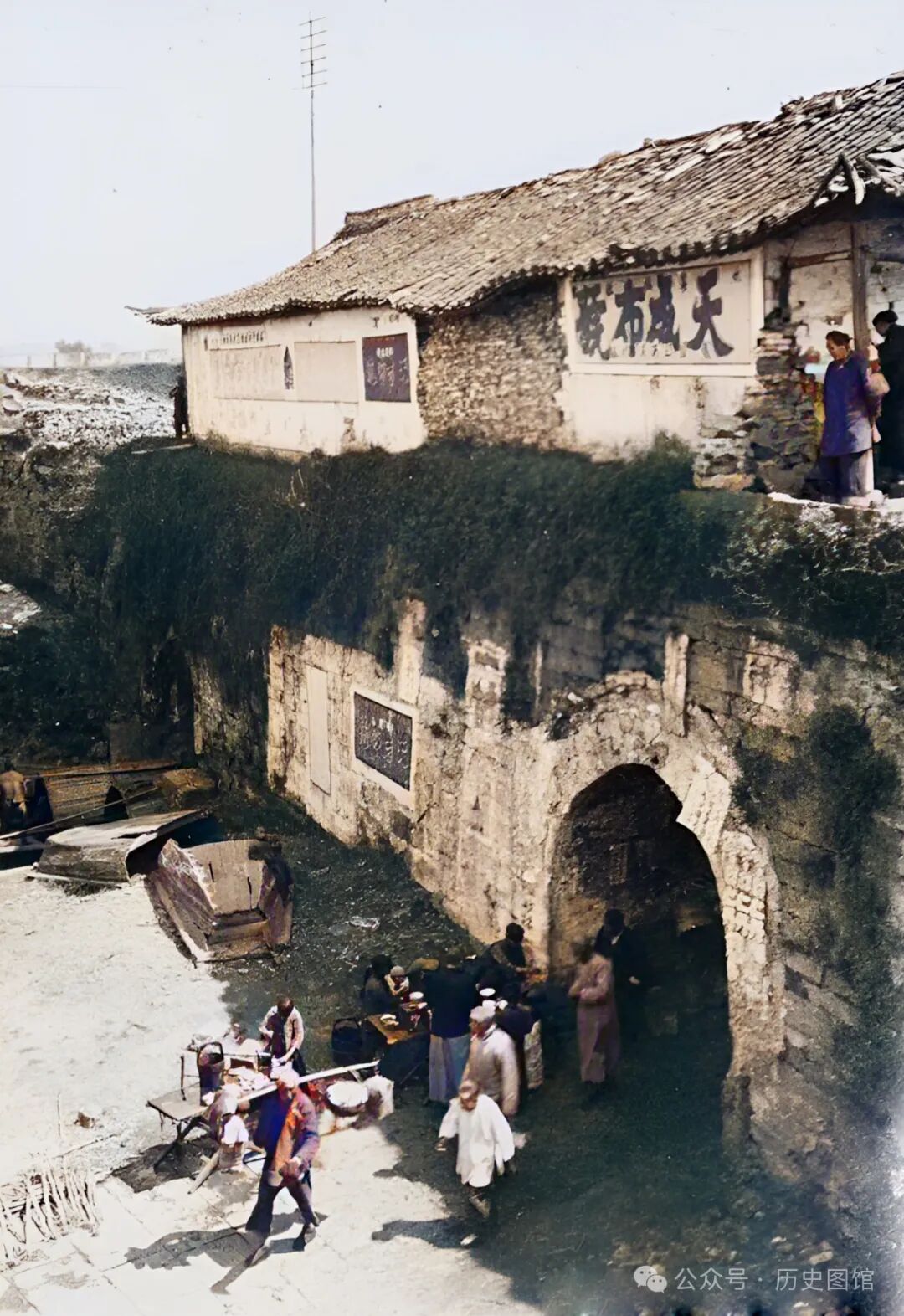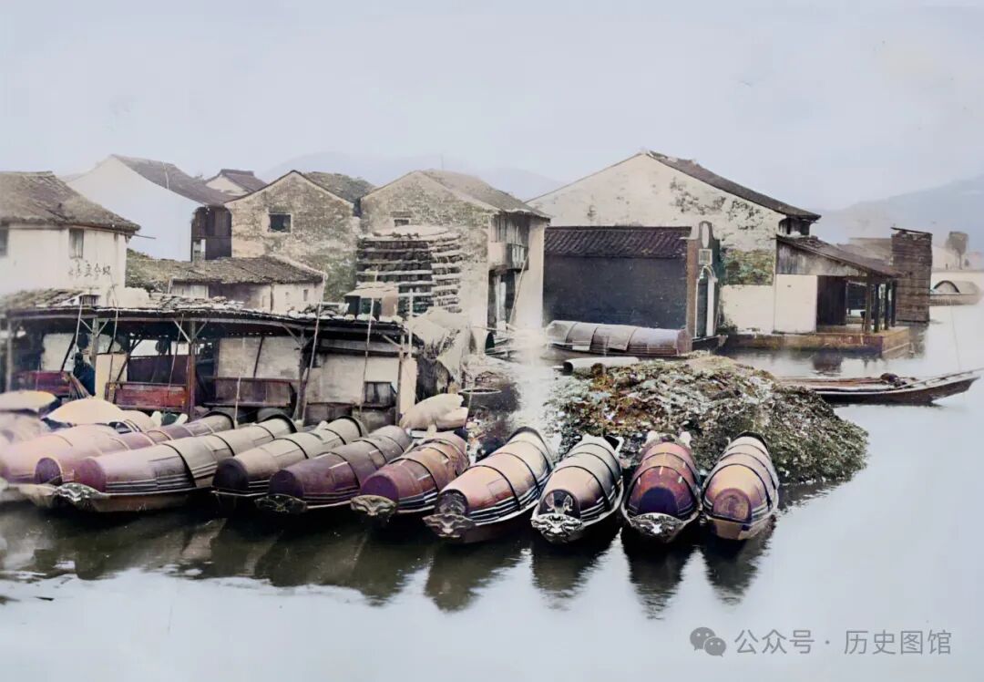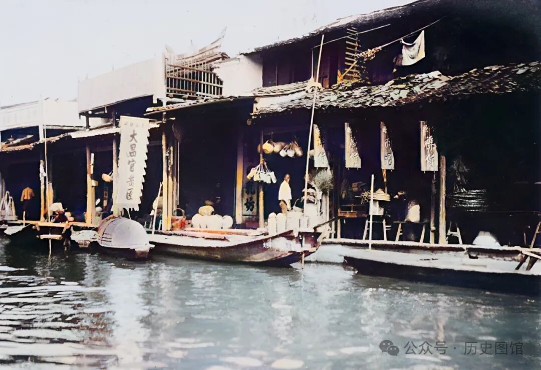 1930年,绍兴城内运河畔景象。河岸边是两层商铺,古色古香,每一间店铺都在开门营业。门口悬挂着各式各样的招牌和旗帜。一艘小船停靠在岸边,准备往船上装酒坛。这种江南水乡景象,在我国北方是不常见的。