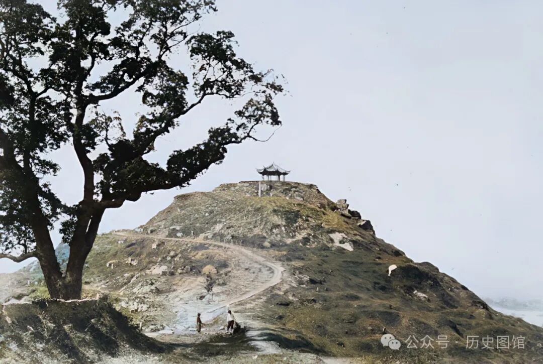 30年代,绍兴府山远眺。在耸立的府山主峰山头上,矗立着一座六角亭子,这就是著名的望海亭。相传,这里是越国大夫范蠡所建“飞翼楼”的遗址,唐代曾改称越王亭。