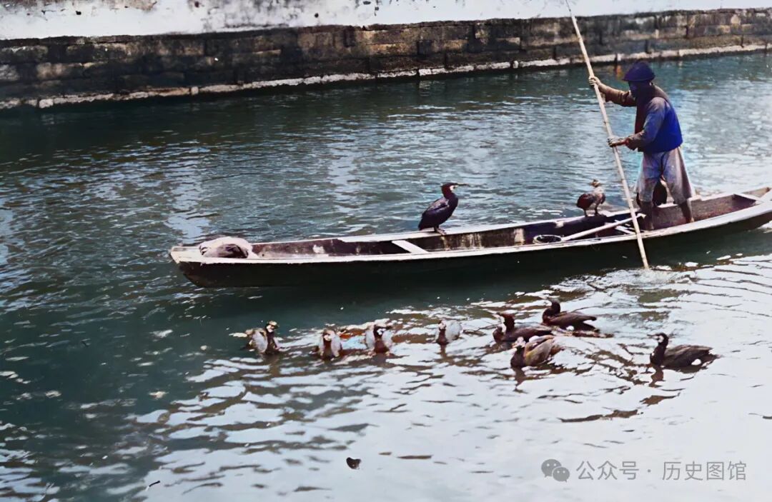在绍兴的一条河道上,一名渔夫驾驶着小船,正在河里捕鱼。他捕鱼没有使用渔网,而是一群鸬鹚。鸬鹚的脖子上系着绳子,当鸬鹚跳进水里捉到鱼后,渔夫将鸬鹚嘴里的鱼取出。这是一种传承了千年的古老捕鱼技艺。如今,已经很少能见到鸬鹚捕鱼的景象了。