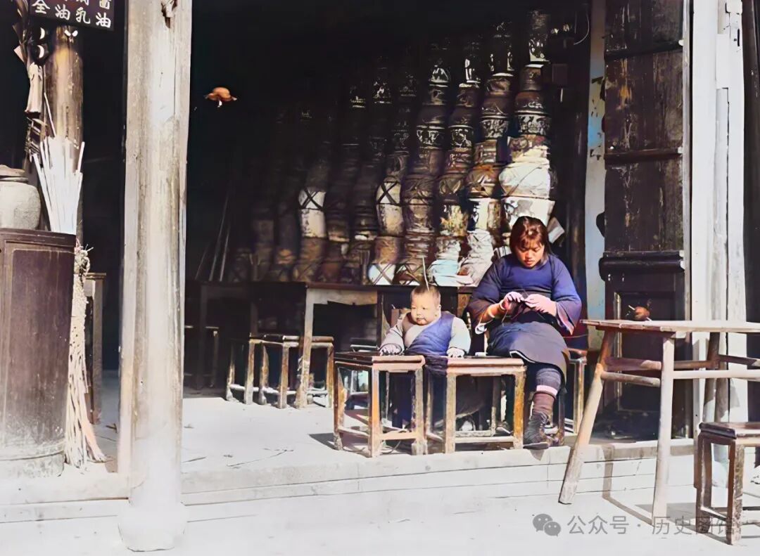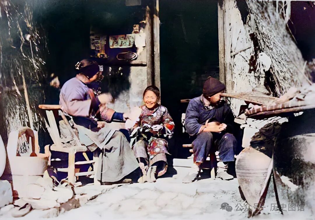 1930年,绍兴郊外的一户人家。几名女子坐在房门口,正在纳鞋底。三人边干活边聊天。虽然房看上去很简陋,生活条件也没有现在好,但她们的脸上满是开心的笑容。这样的画面,充满了生活气息。