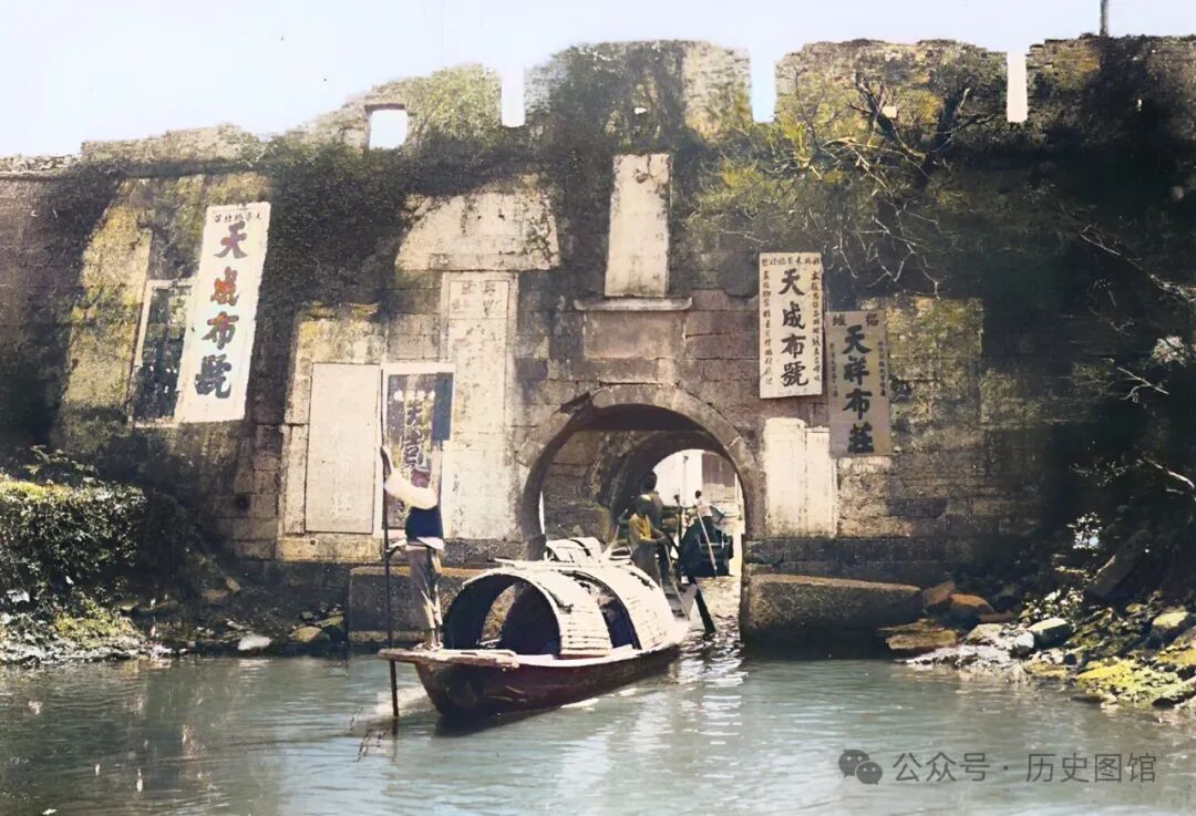 这是绍兴的水路城门东郭门,河道之上修建有一座城门,船只可通过拱形门洞进出绍兴城。城门上方有垛口,墙壁上贴着一些商号的名称牌子。