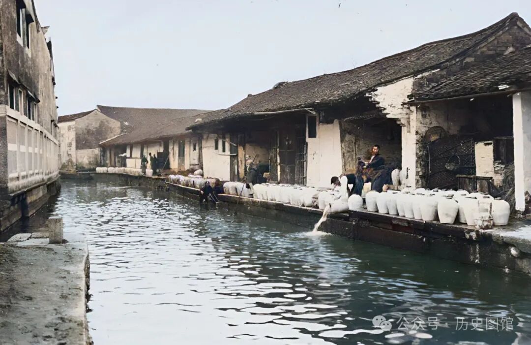 这张照片,反映的是30年代绍兴城内的制酒手工作坊。几名工人正在清洗酒坛。绍兴黄酒。又称绍兴老酒,越陈越香。绍兴黄酒很有名气,在清朝时就被评为全国十大名产之一。