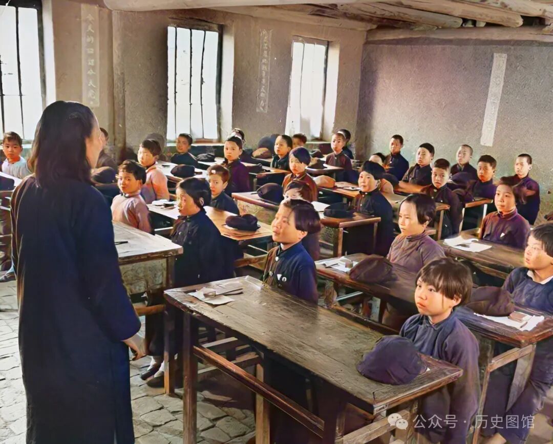 1947年5月,临潼当地一小学课堂上,孩子们正在认真地听老师讲课。这个班级人数不少啊,两个人一张课桌,共有48个学生。教室地面上铺着地砖,这比六七十年代一些偏远地区的教室好得多。