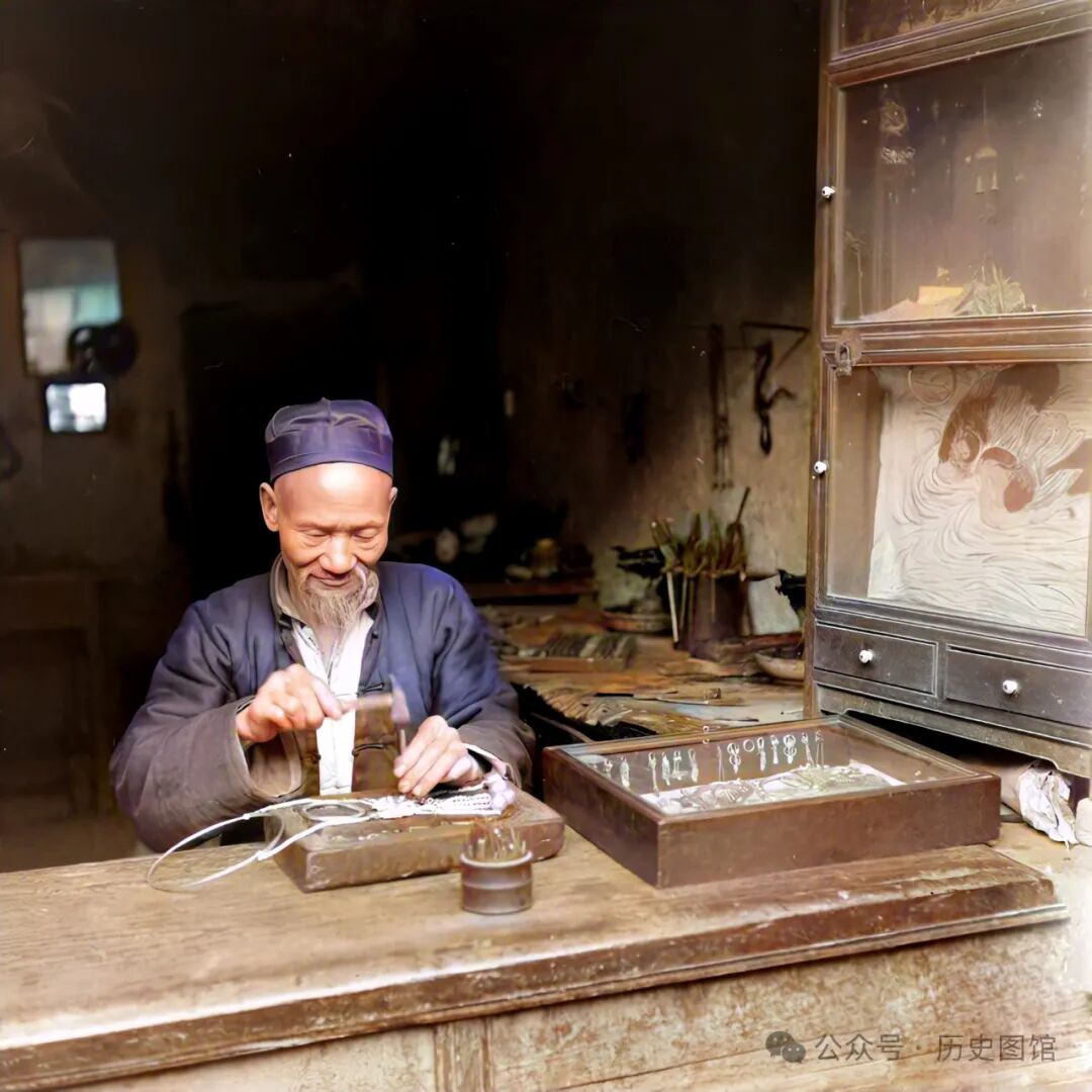 40年代,陕西临潼一位打金匠人,正在柜台前忙碌着。他制作的是一挂银饰,用锤子和凿子在银质饰品上压制出图案和纹路。在他前面的方盒子里,装着制作好的银饰制品。这是一种传统手艺,需要有扎实的制作经验和工匠精神。