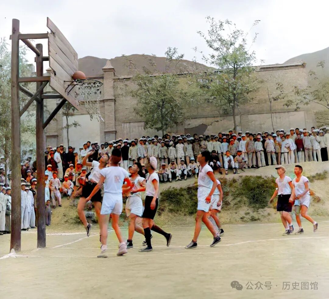 1947年,临潼中正中学的学生们,正在操场上举行篮球比赛。虽然场地设备有些简陋,但操场边站满了身穿校服的学生。球员们身手矫健,在激烈的拼抢下不断有球进入篮筐,引得众人喝彩声不断。