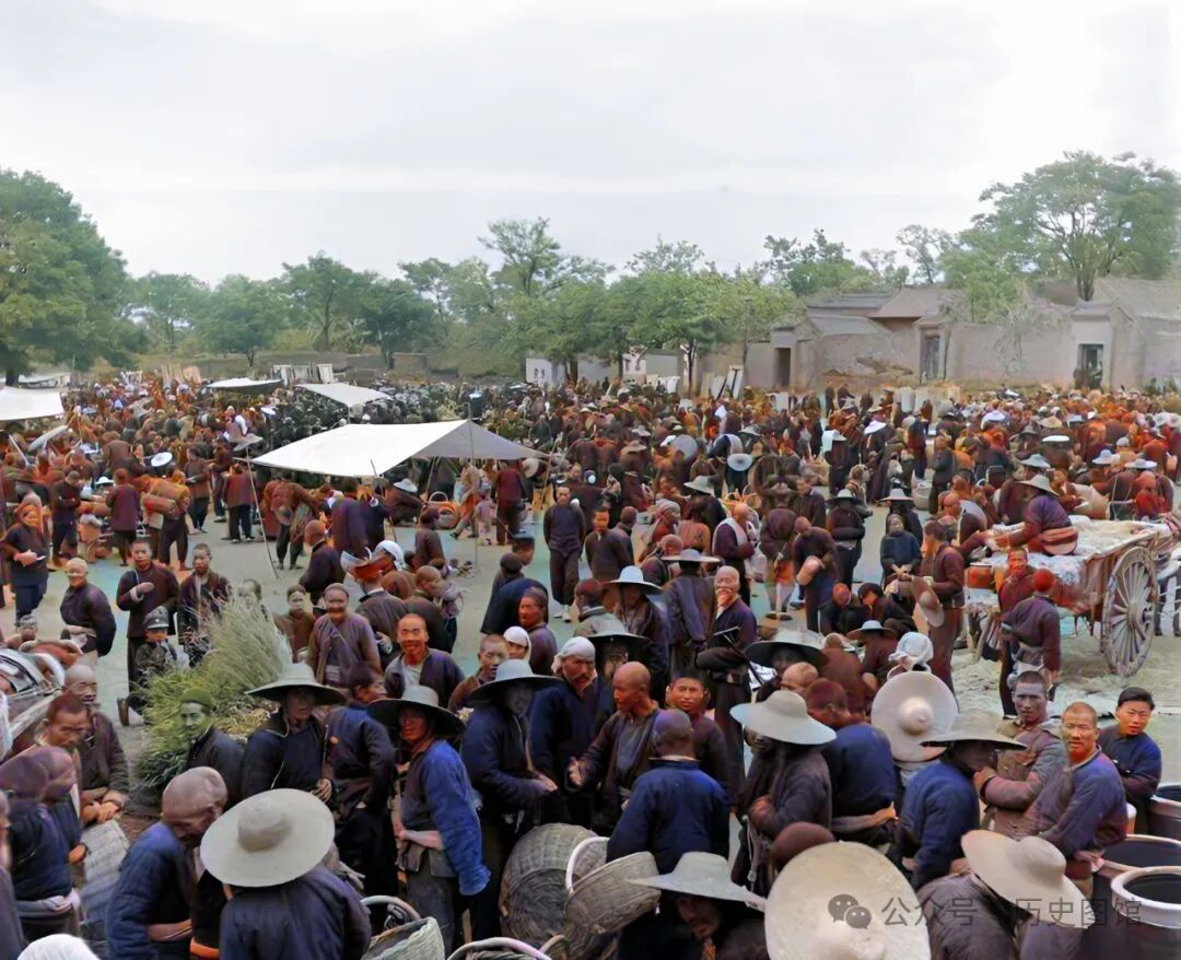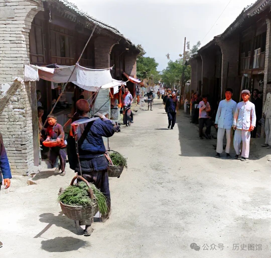 40年代,陕西临潼正在举行一场农贸会。集市上人群熙熙攘攘,在路边一个售卖农具的摊位前,挤满了人。在集市上,有些摊贩撑起了遮阳棚。还有一些人赶着马车前来参会。像这样的农贸会,每年都会定点举行一次,现场十分热闹。