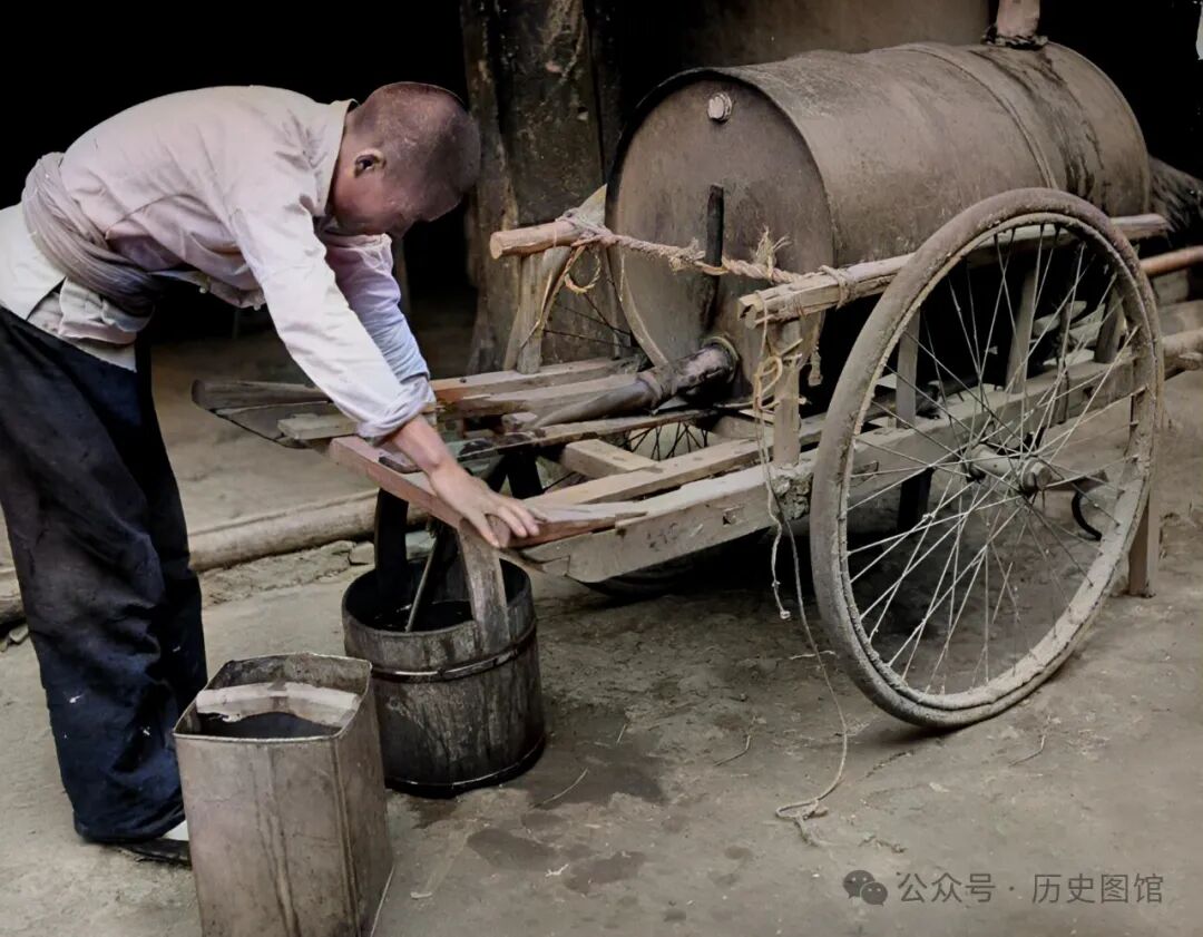 40年代,陕西临潼一处仓库正在承重粮食。两人抬杠,一人扶着大秤。装粮食用的木制粮斗上有写有“临潼县田管处制”字样。从几个人身上的穿着看,抬杠的两人是交粮的农民,而扶秤的人应该是粮站的一名工作人员。