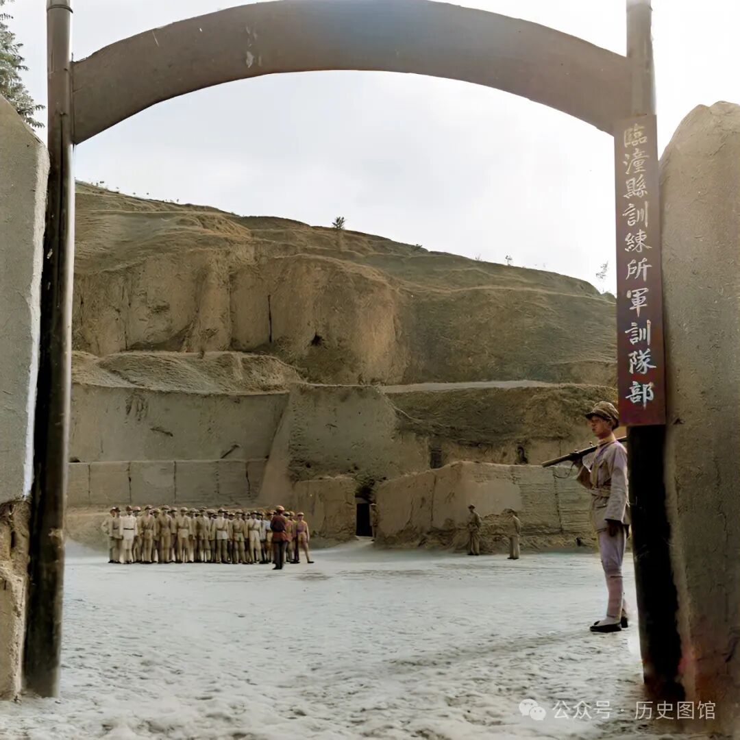 40年代,陕西临潼山脚下的一处训练基地,门口的竖牌上写着“临潼县训练所军训队部”。院内的操场上,一些士兵正在教官的指导下训练。大门口,有一名卫兵在站岗。操场边上院墙内的窑洞,是训练士兵们的营房。