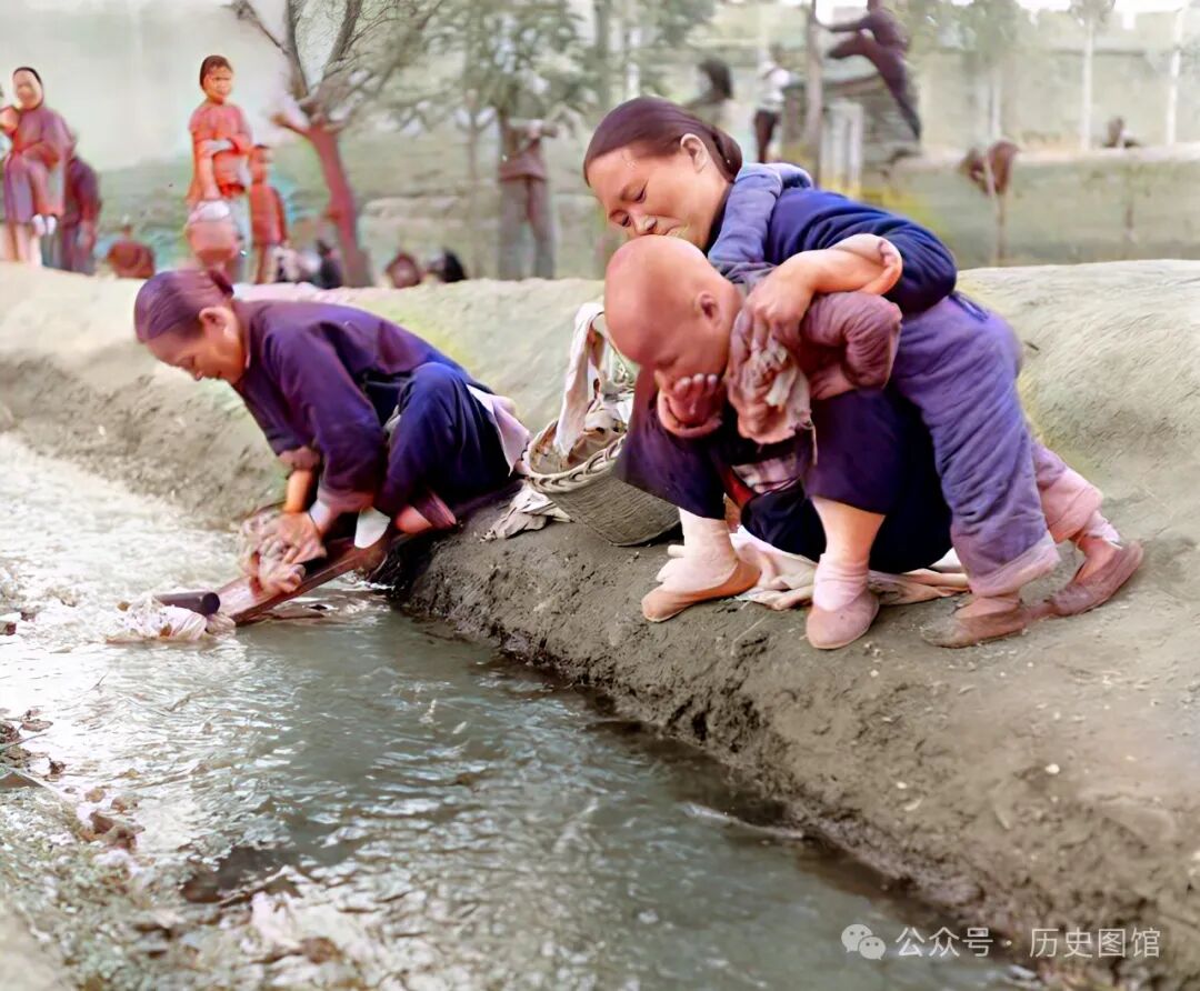 1947年5月,在一条小溪边,一名妇女在搓衣板上洗衣服。另一面妇女,抱着她的孩子,正在为小家伙洗脸。不远处,一些孩童在河堤上玩耍。