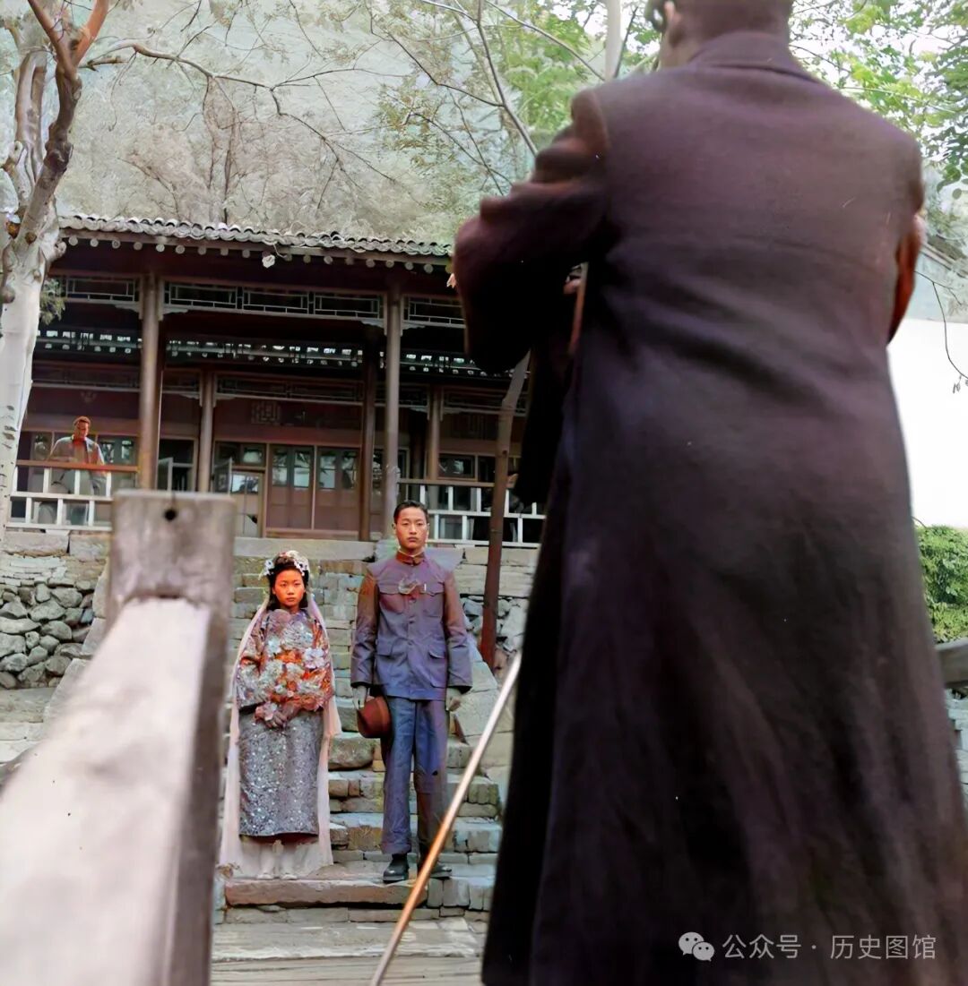 40年代,陕西临潼一个大饭店里,两名新人正在举行婚礼。新郎年轻帅气,穿着笔挺的中山装;新娘貌美如花,身上披着西式的婚纱。一名摄影师站在桥上,为他们拍摄结婚照,定格下这对新人幸福的瞬间。