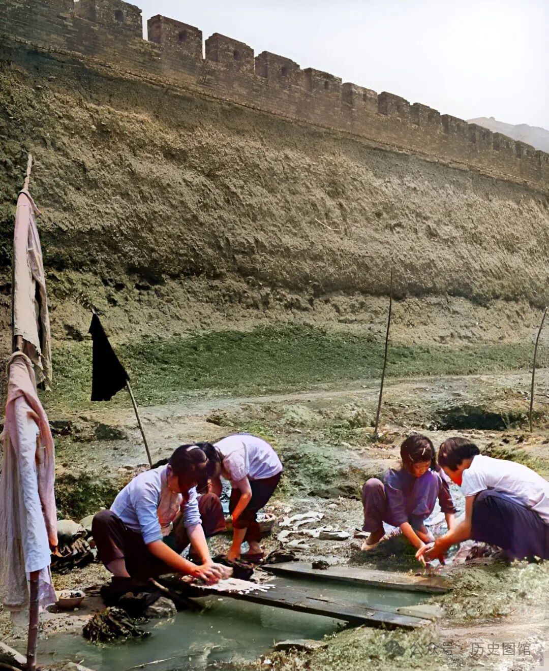 1947年5月,临潼城外的一条小溪边,几名年轻女子正在这里修衣服,清洗好的衣服挂在旁边的树枝上。在她们身后,城墙显得十分高大壮观。从这个角度看,过去的城墙是土墙。