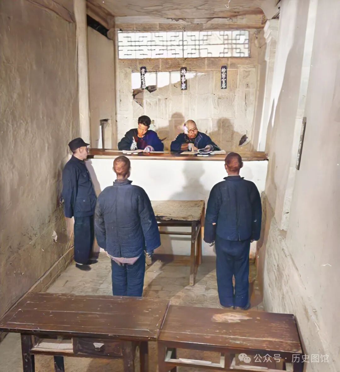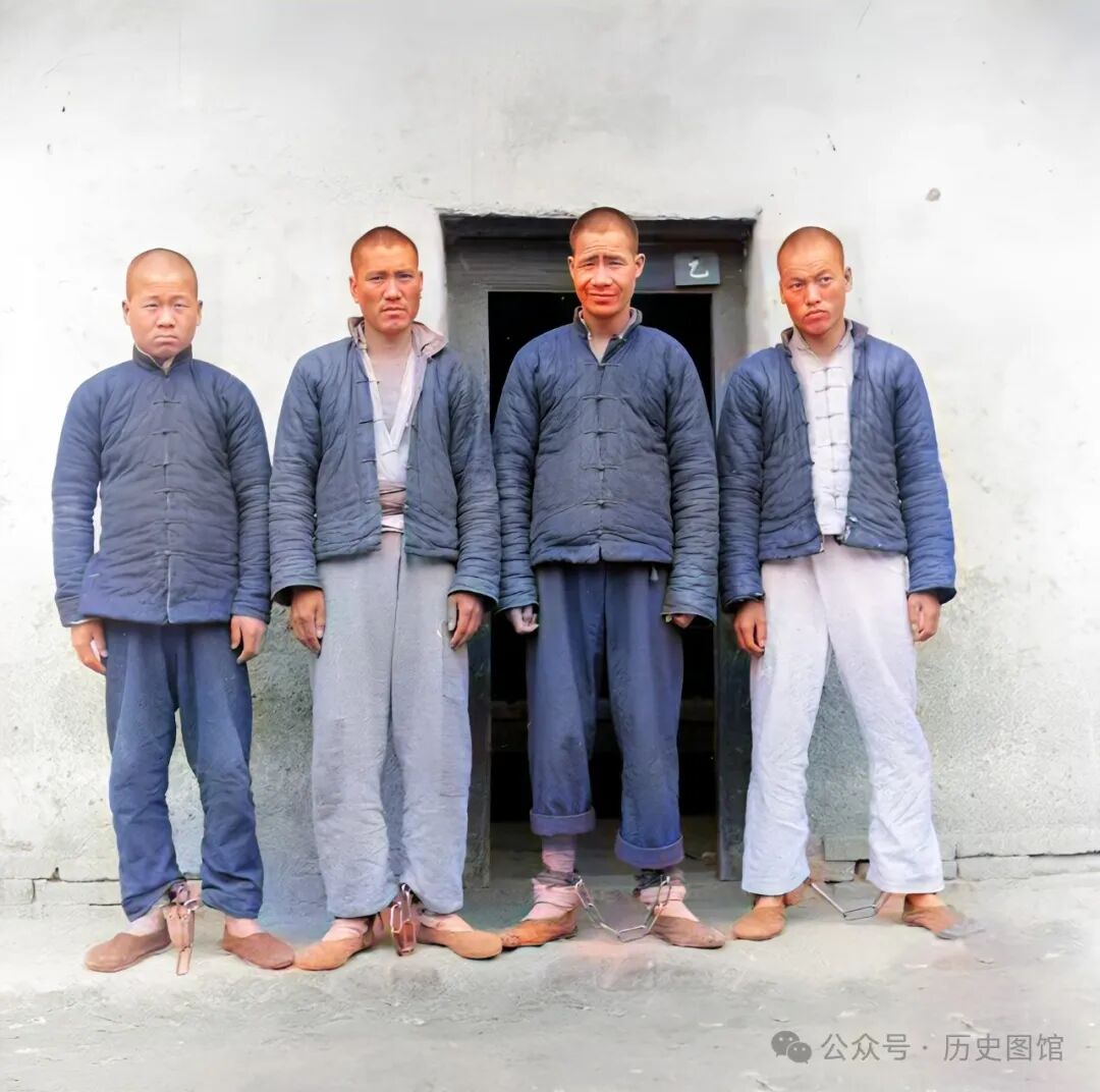 在临潼一座监狱里,几名犯人站在老房门口放风。他们的脚上戴着沉重的脚镣,可得出都是重刑犯人。他们身后牢房的门框上,挂着一个写有“乙”字的小牌子。四个人年纪差不多,每个人脸上的表情各不相同。