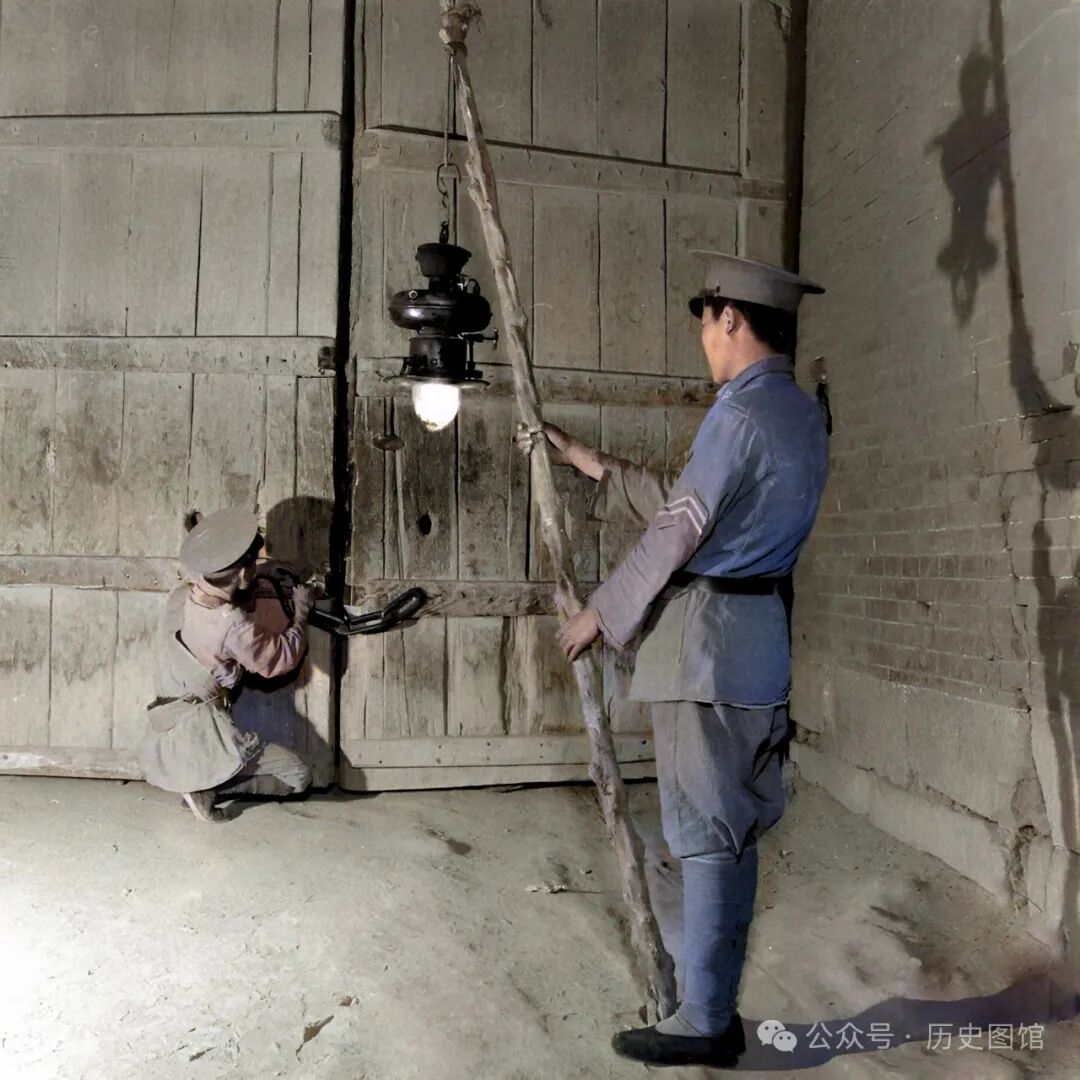 夜幕降临,临潼城门开始关闭。在城门洞下,一名卫兵关闭城门并上大锁,另一面卫兵用木杆举着汽灯为其照明。临潼的城门很厚实,锁链也很粗大。可见,当时临潼的安保措施还是很到位的。