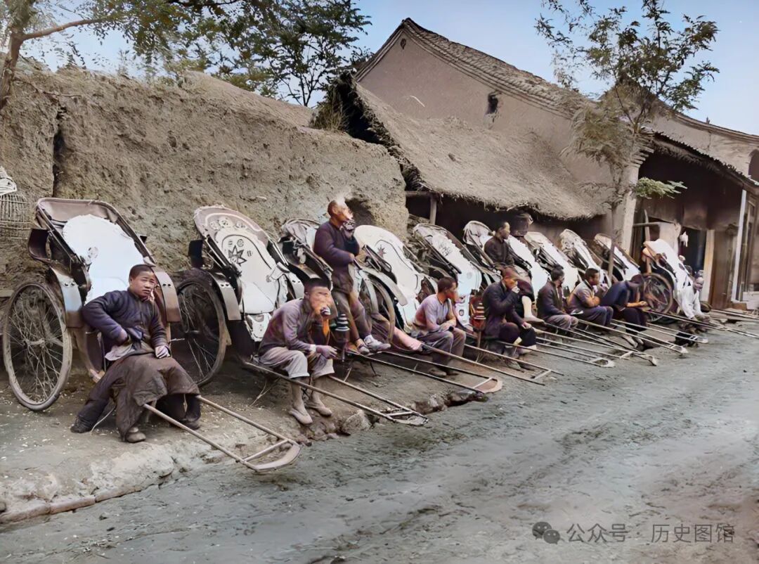 在临潼城内的一条街边,有很多黄包车师傅,他们坐在车上,在这里等待载客。这里应该是一个很繁华热闹的地段,容易拉倒客人。拉黄包车是一个很辛苦的工作,但是依靠这个,他们也能养家糊口。