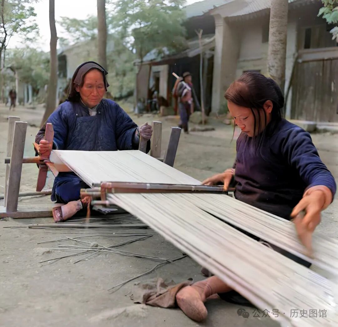 两名当地妇女正在院子里织布。这是一种传统的织布方式,需要两个人配合,将棉纱织成棉布。在上世纪六七十年代,在一些偏远的农村,仍能见到这样织布的场面。