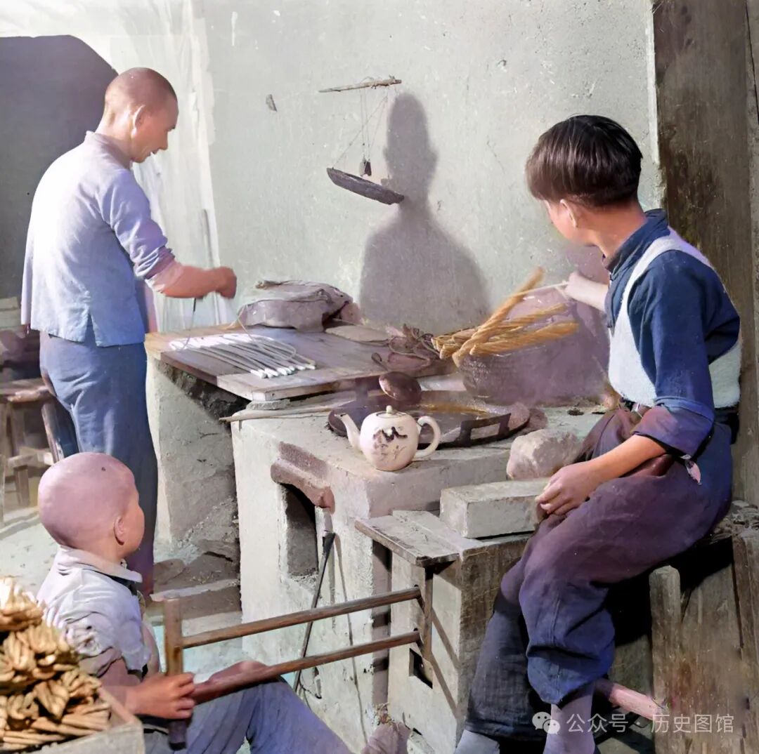 1947年5月,陕西临潼一间制作油炸食品的小铺里,父子三人正在忙碌着。父亲在案板上制作好面胚,大儿子坐在油锅边,油炸麻花。小儿子则坐在灶前烧火,用手推拉着风箱,把炉膛里的火烧得旺旺的。三个人配合默契,制作的麻花香气扑鼻。