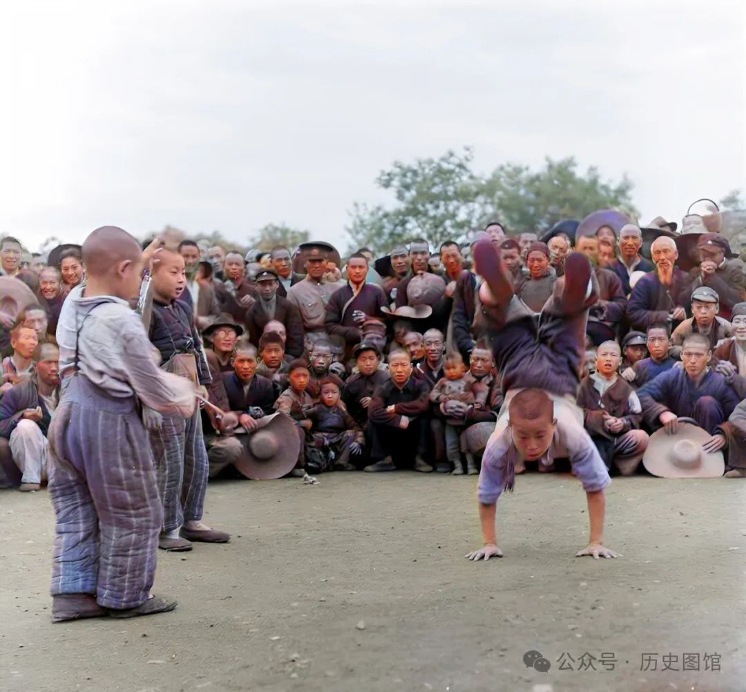 40年代,在临潼一个庙会上,几名儿童正在表演杂技。一名儿童双手撑地倒立前进,另两名儿童敲锣助威。看他们的年纪,只有几岁光景,小小年纪就开始闯江湖了,真是不容易。人们围在场子四周,看得津津有味。人群中还有一名士兵。