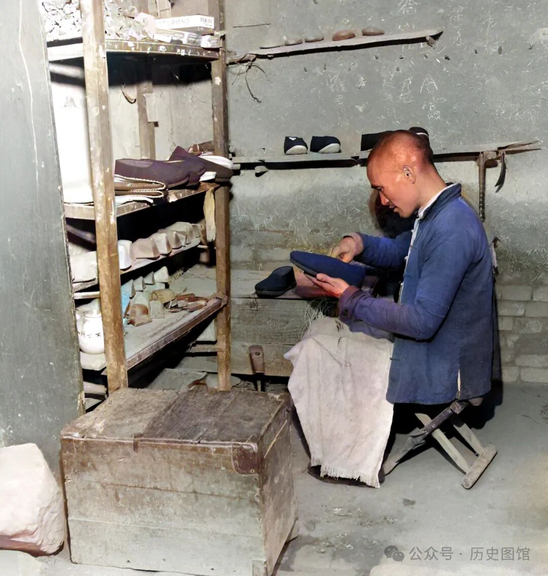 在一家制鞋店里,一名鞋匠正在忙碌着制作布鞋。鞋架上摆放着制作好的布鞋,还有一些制鞋的工具,能看到有木制的楦头等。楦头是中国传统的制鞋用具。把木制削成足形,填在鞋中以便适合入脚。