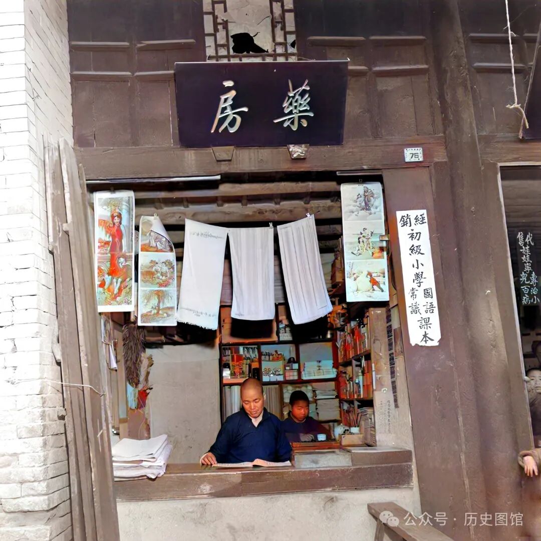 这张照片,拍摄于临潼城内的意见药房。这间药房真是经营有方,他们还对外经销初级小学语文课本。在柜台上方的绳子上,悬挂着一些知识挂图,还出售毛巾。药房先生正坐在柜台后面看书。