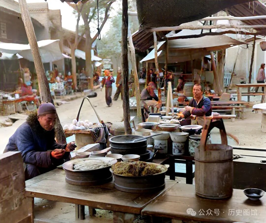 这是40年代临潼当地的一条小吃街。街边店铺门口撑着遮阳棚,商品直接摆在了门外。在街道的另一边,有不少露天小吃摊。照片中,一名男子正坐在桌边津津有味地品尝美食。桌上的笼屉里盛放的是卤面之类的面食。看照片,似乎能闻到扑鼻而来的香味。