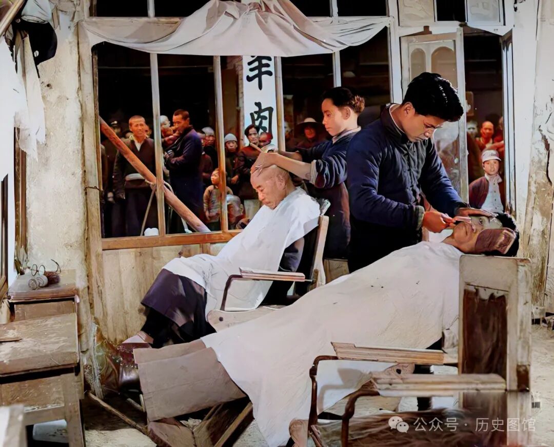 40年代,陕西临潼一间理发店里。两名理发师正在为顾客理发。这种理发椅在七八十年代还能看到,椅背可以向后倾斜。看到有摄影师在理发店里拍照,门外街上的行人也都驻足观看。理发店对面的店铺,好像是卖羊肉的肉铺。