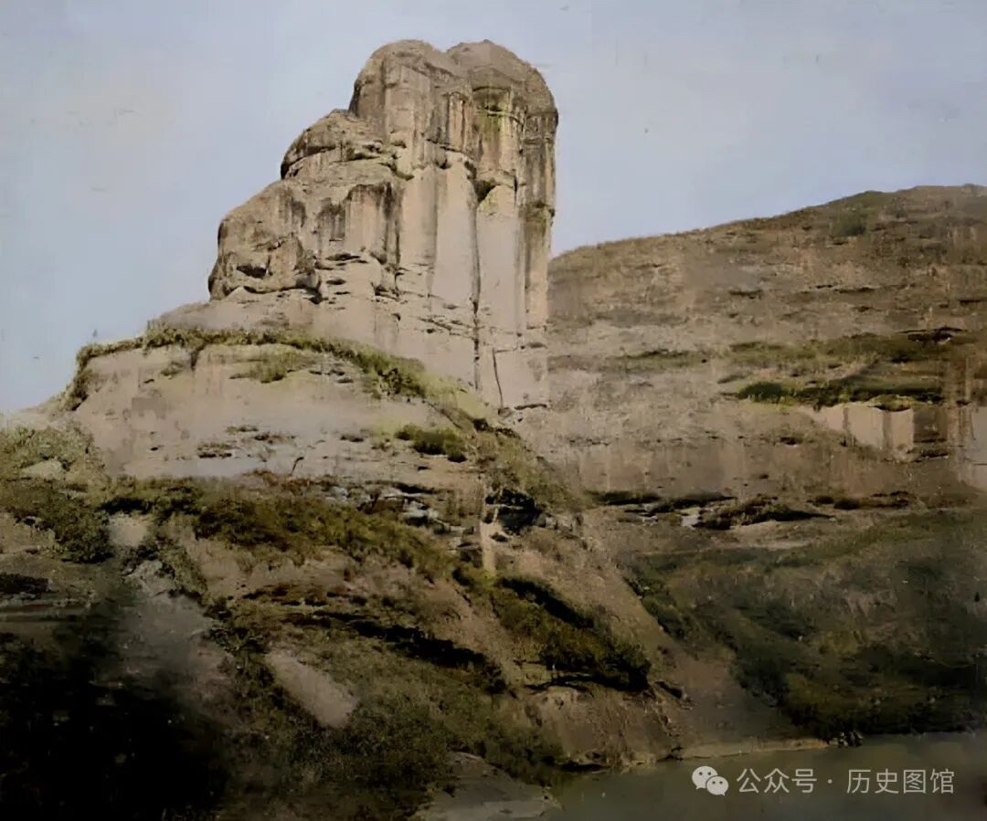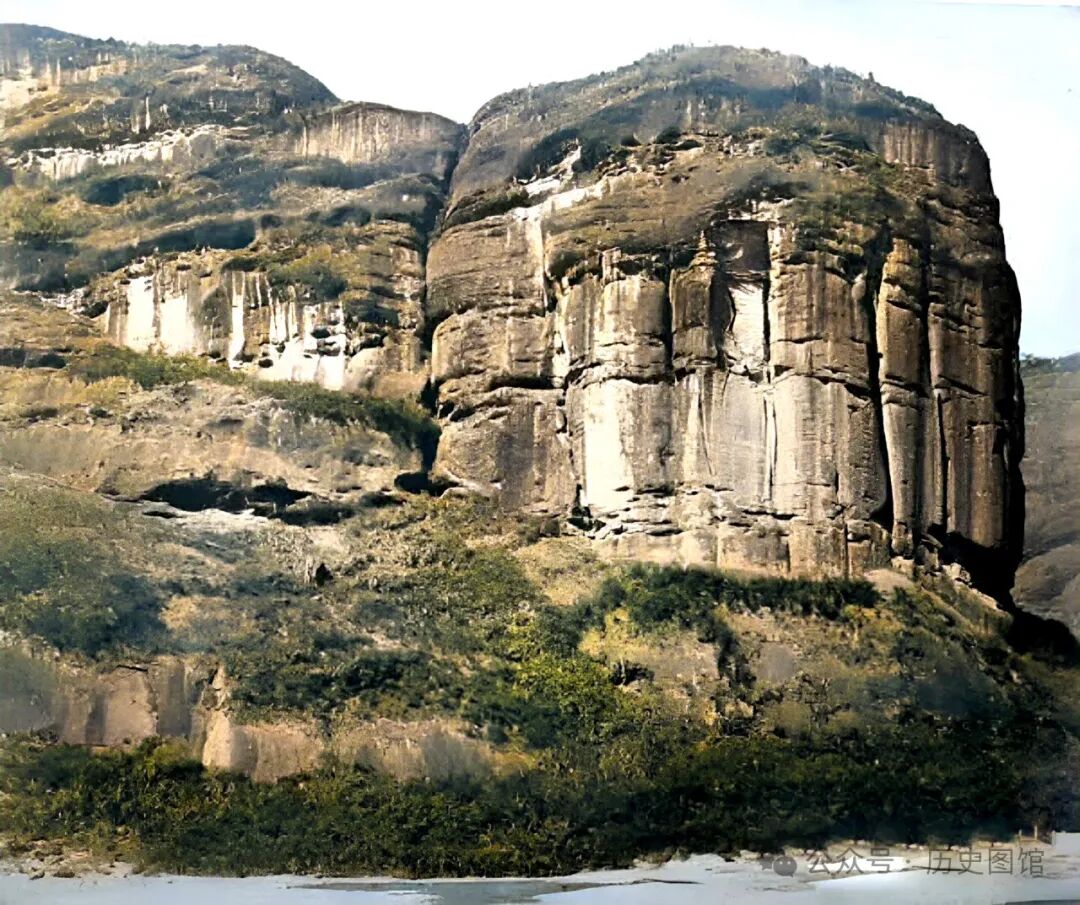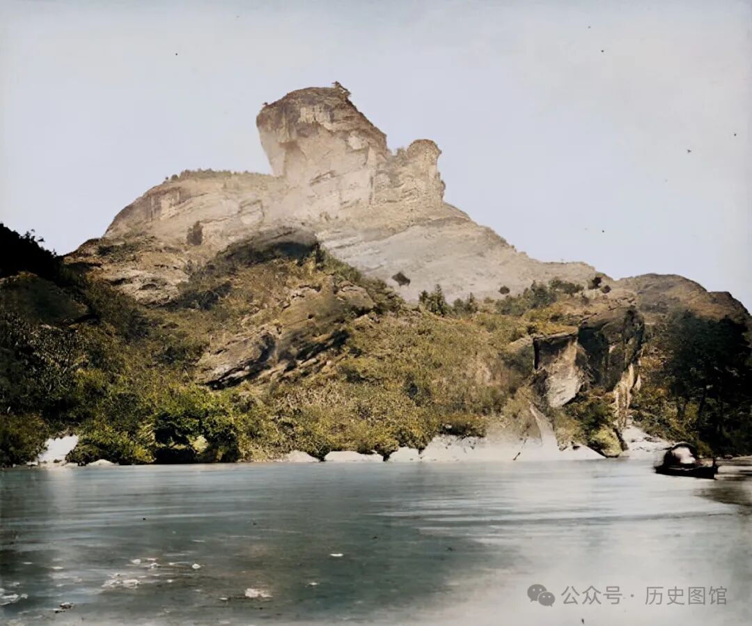 1869年,福建武夷山小藏峰前的景象。小藏峰位于三曲溪南,也叫仙船岩。岩有河水流过。泛舟九曲,仰望峰顶,令人叹为观止。