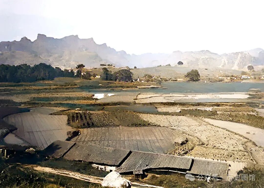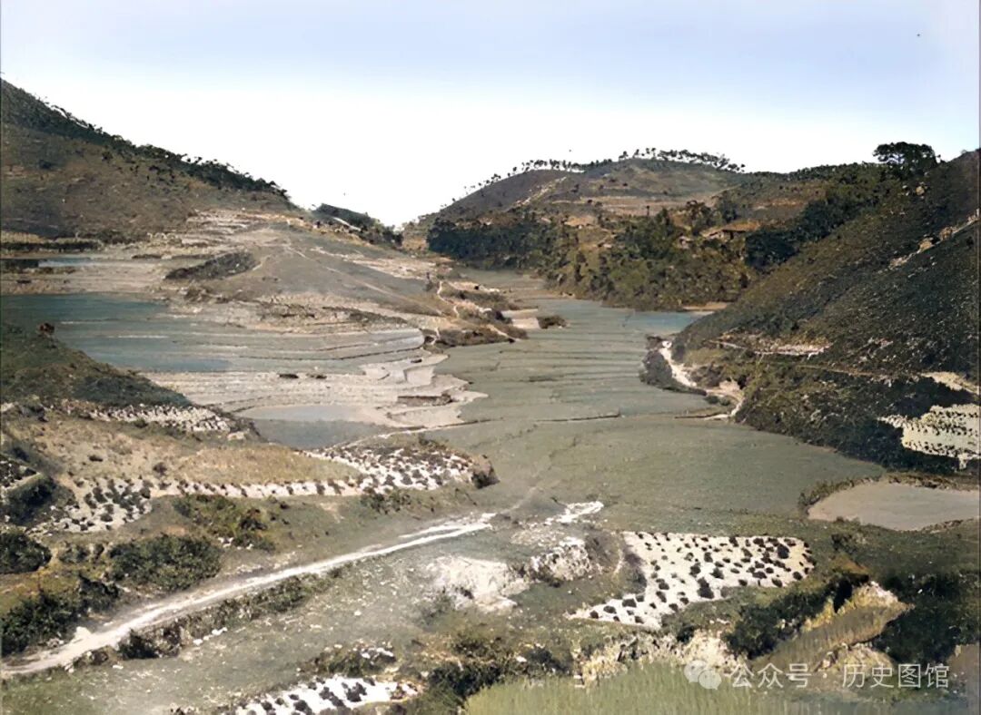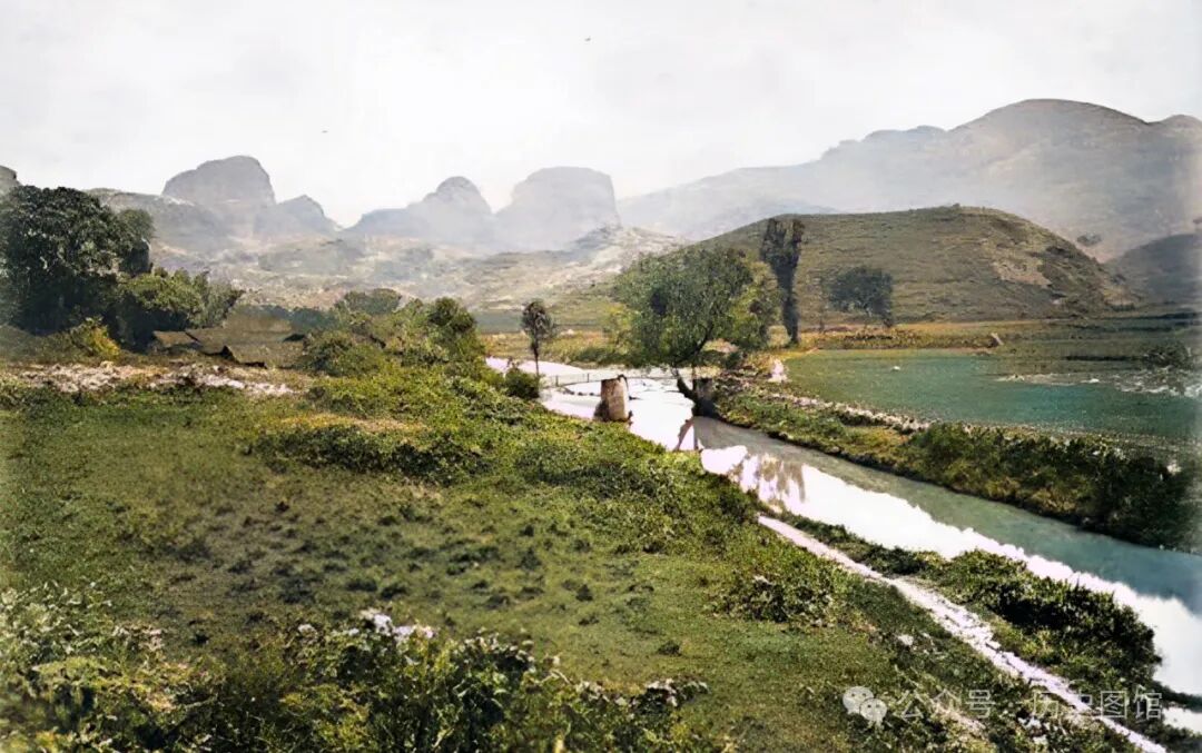 一百多年前的福建武夷山老照片。河道两岸是良田,一座小桥横跨在河面之上。远处,山峦起伏,山清水秀,景色很美。
