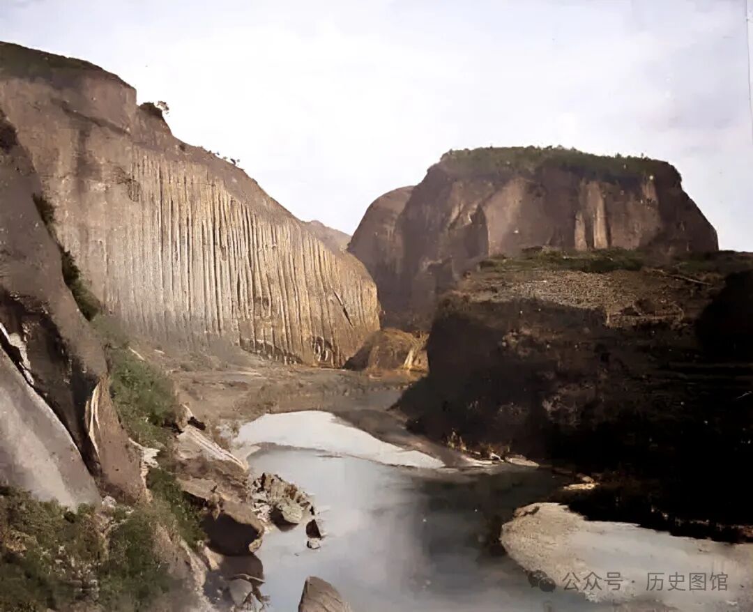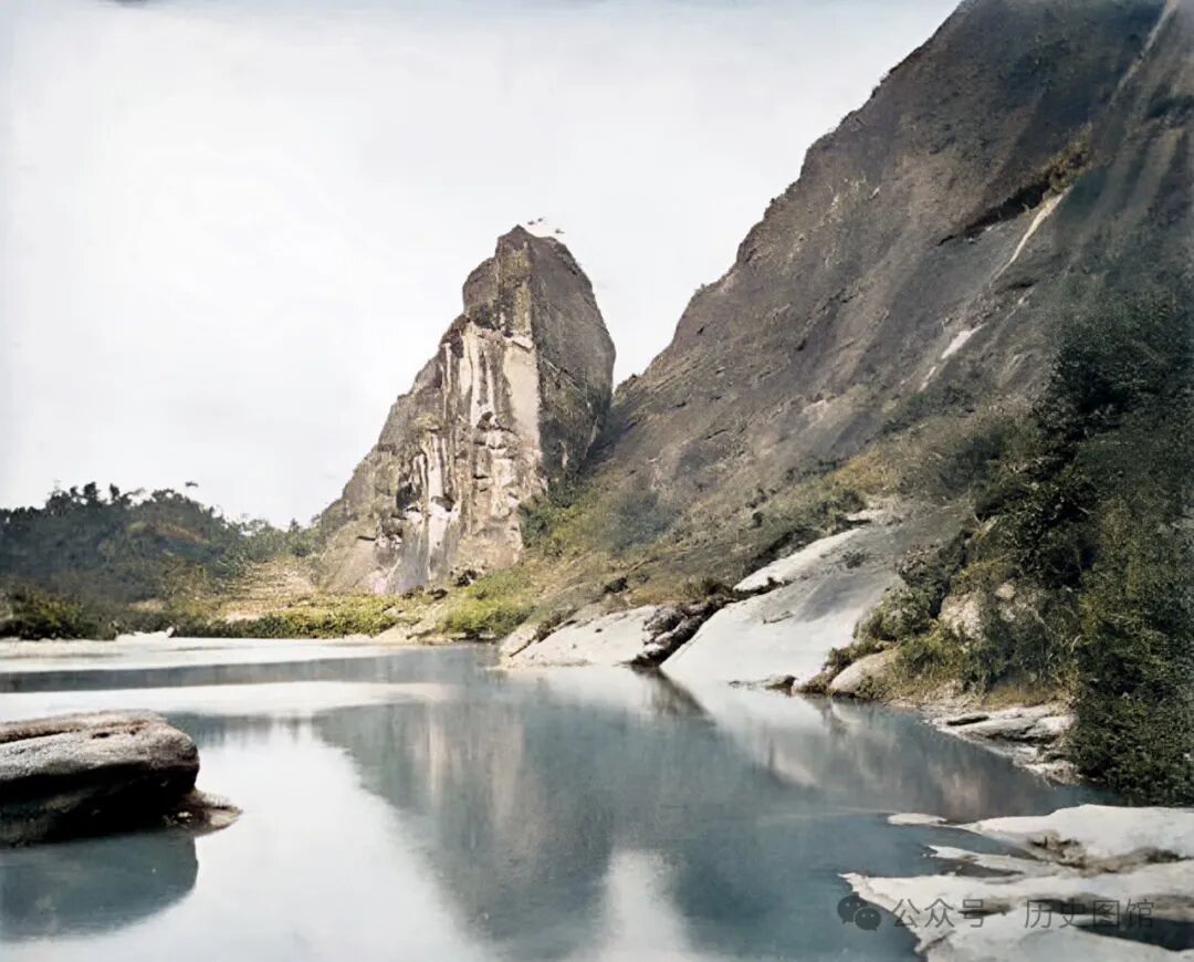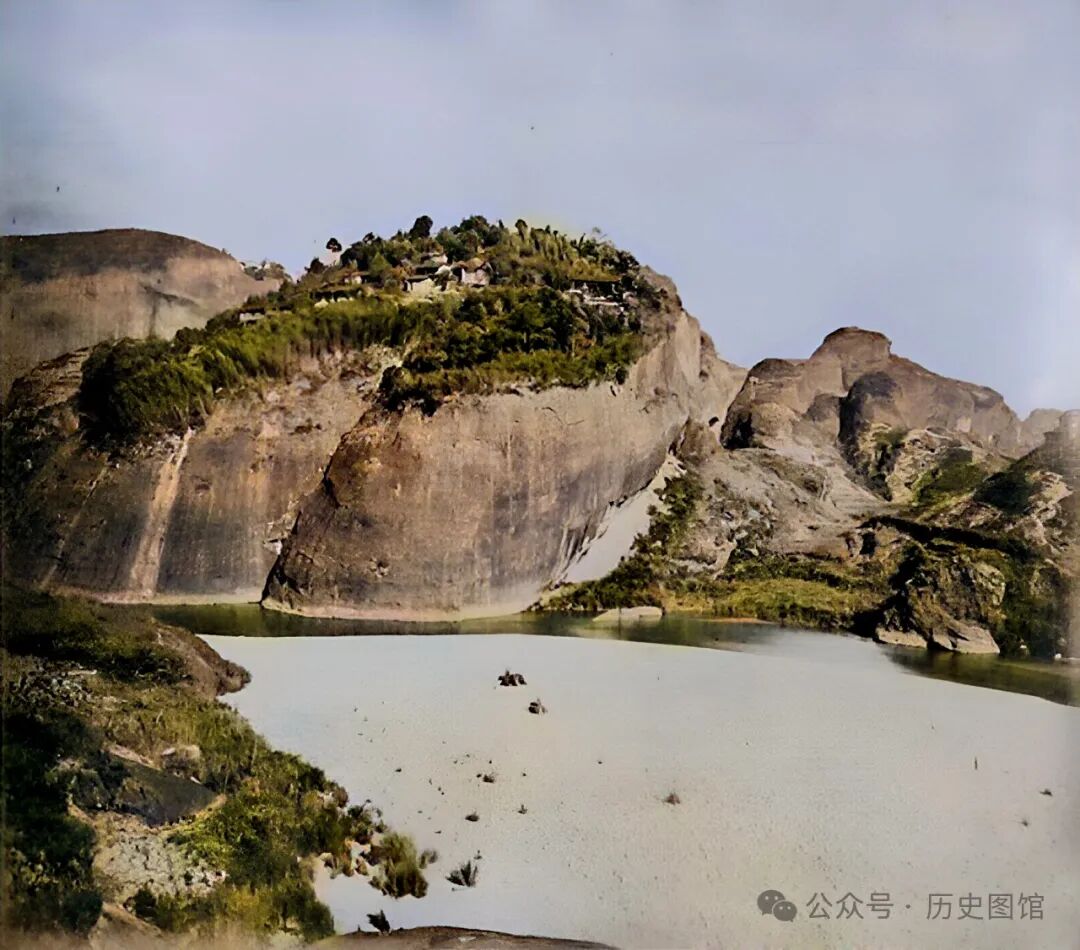 1869年,福建武夷山仙还岩景象。这处岩岩石外形奇特,亿万年前白垩纪晚期大自然的伟力,造就和留下了如此鬼斧神工般的所在。在岩石下有一汪水潭,清澈见底。远处的山峦连绵不绝。